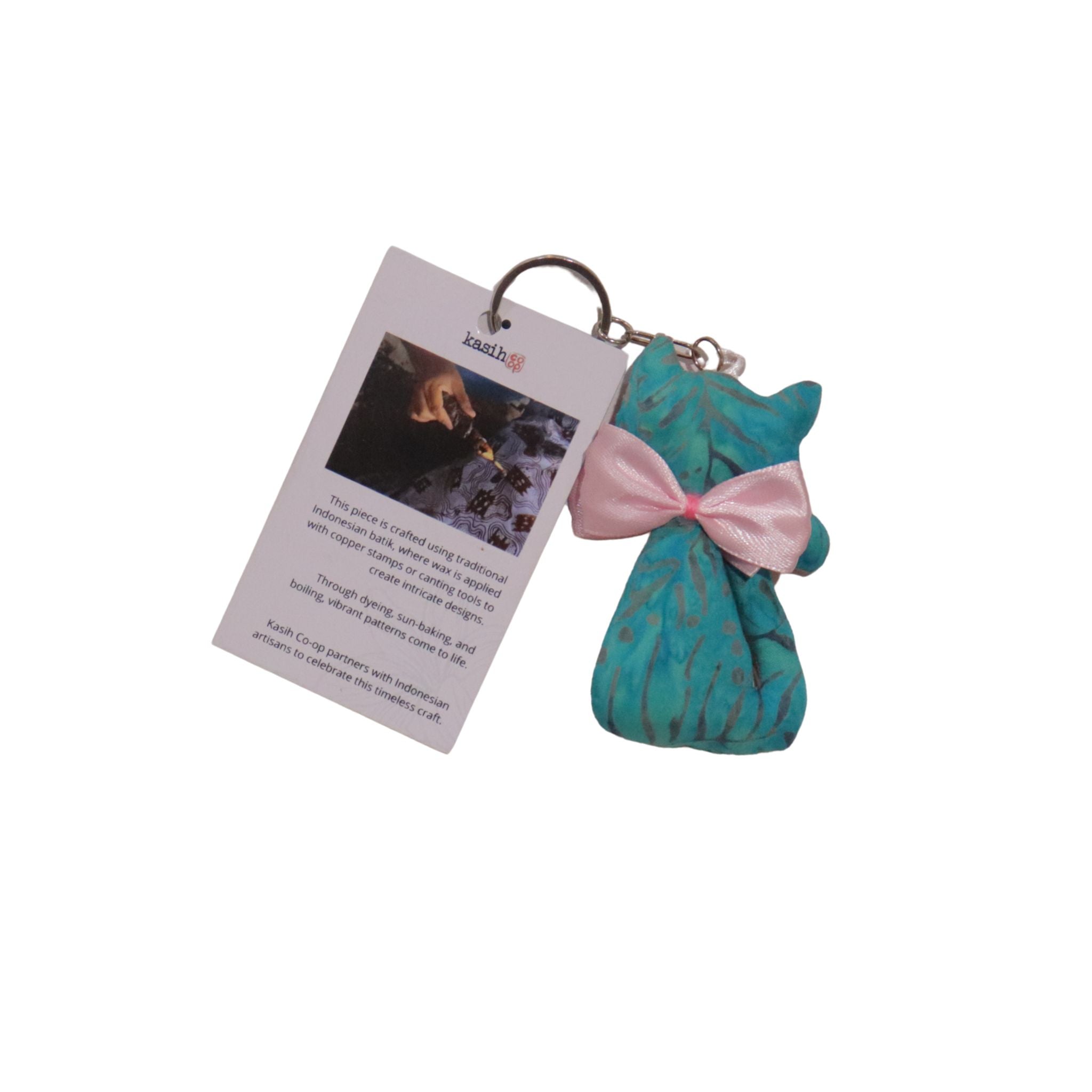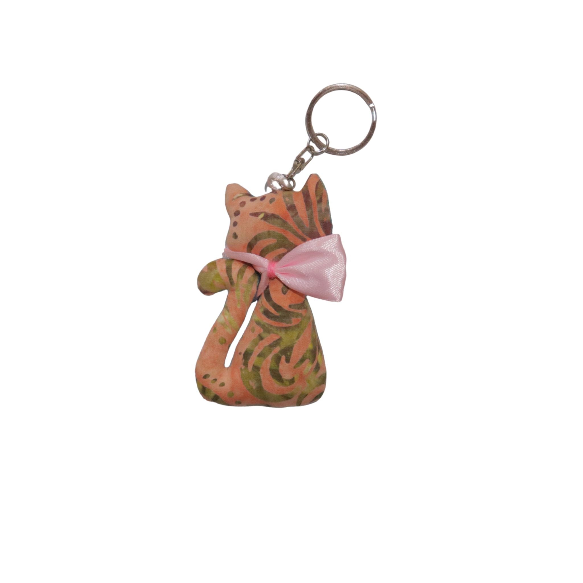 Small Size Batik Keychain, Cat, Teal Blue or Orange with a Pink Bow, Bag Charm, Key Chain, Key Fob, Blue, Handmade, Teal, Hand Dyed Batik