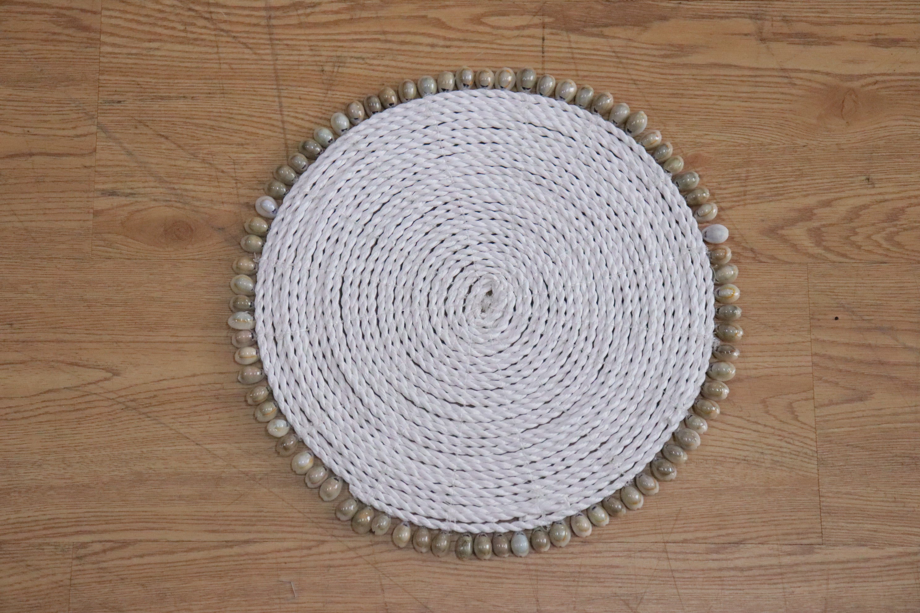 This is a placemat made of laces & cowry seashells, handmade by artisans.