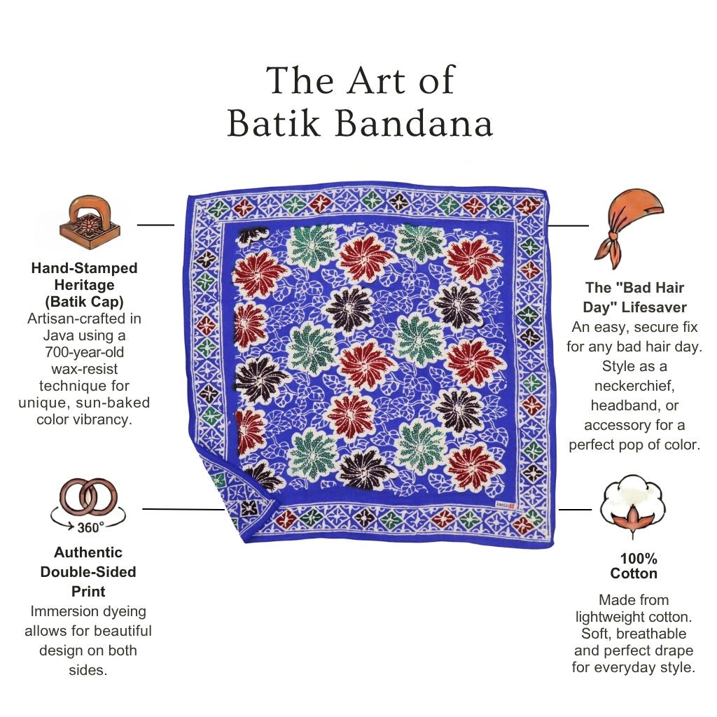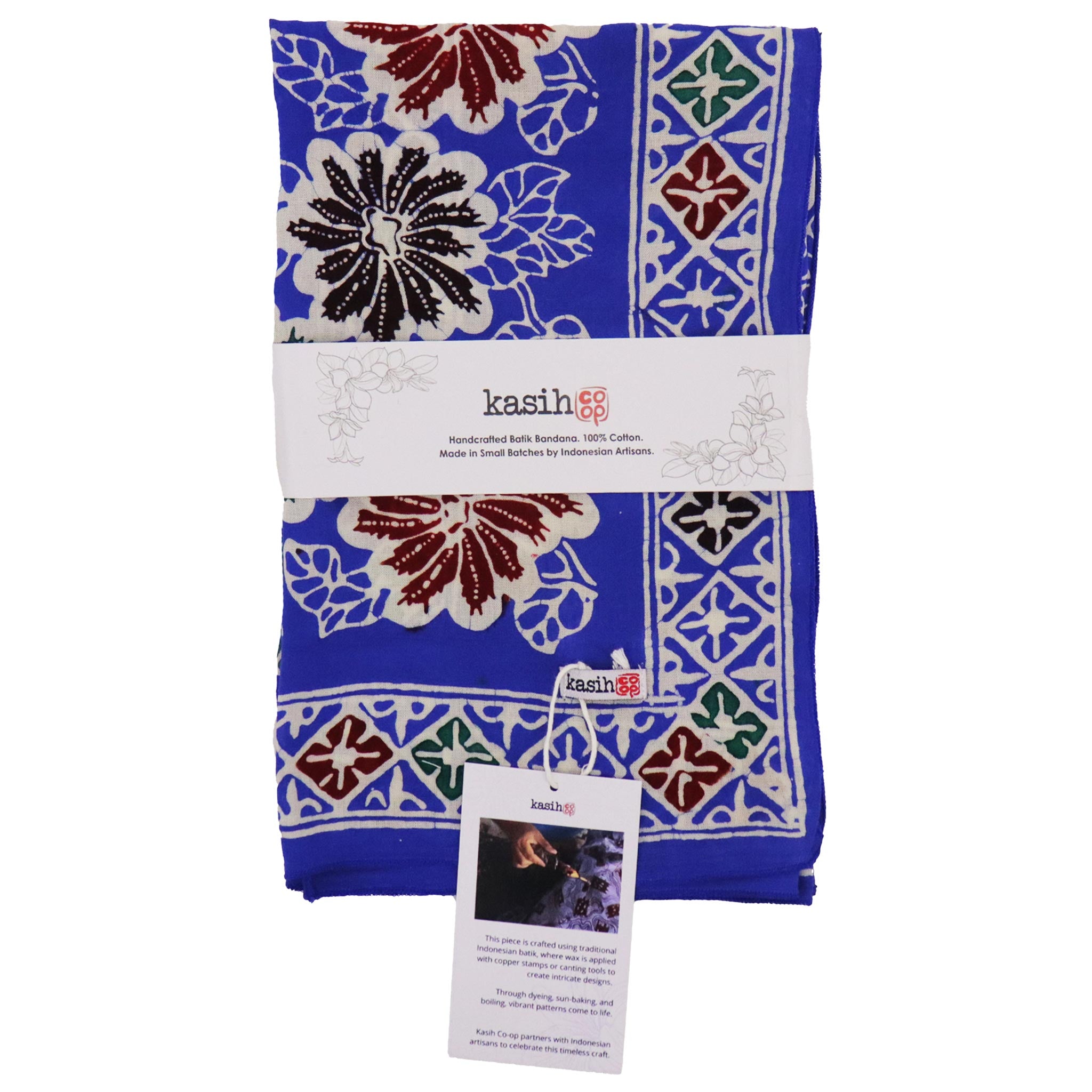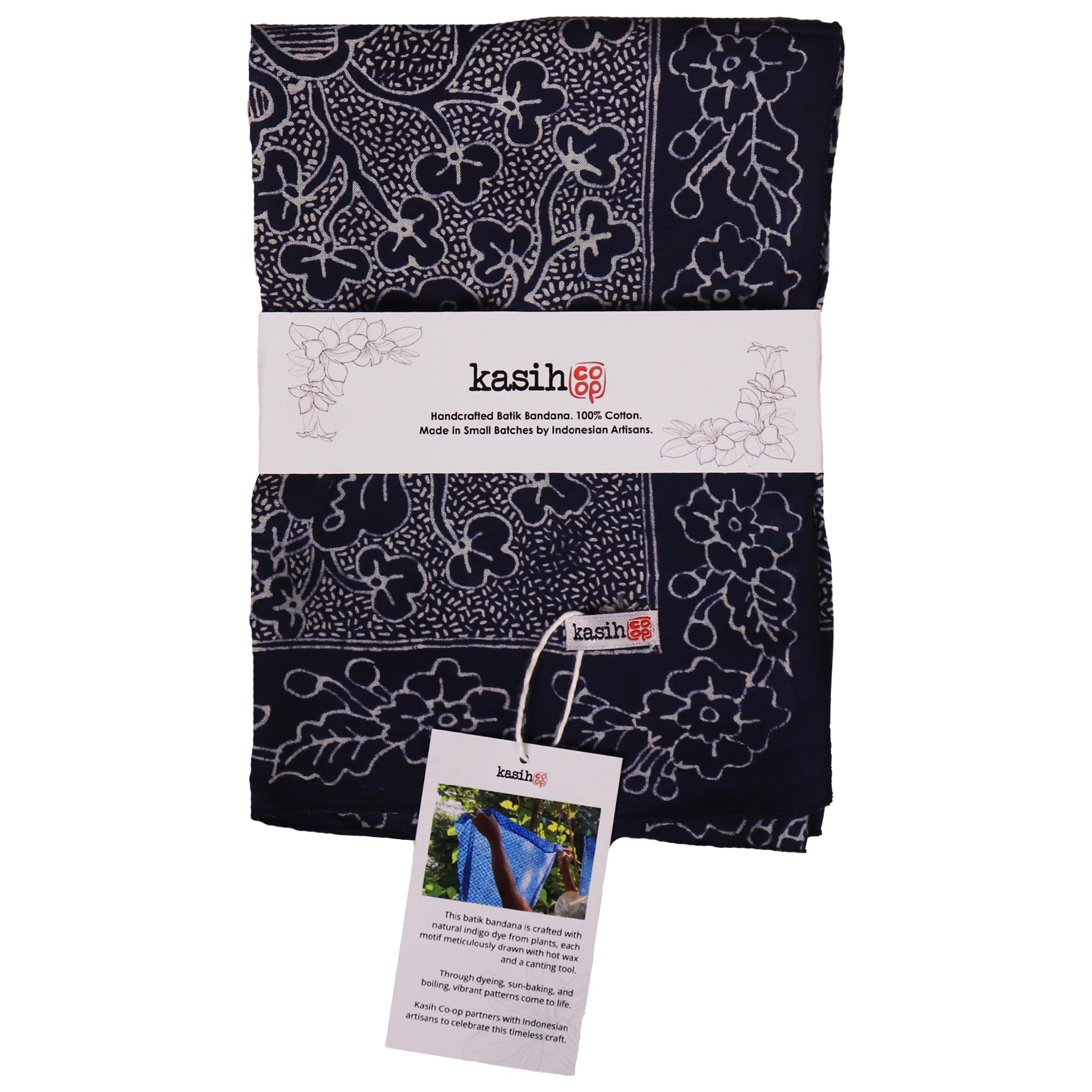 Our Kasih Co-op's bandana is created using the traditional Batik Cap (Hand-Stamped) or Batik Tulis (fully hand drawn) wax-resist technique. Artisans apply hot wax onto the 100% cotton cloth before it is submerged in dye, a meticulous, multi-step process that often includes "sun baking" the fabric to set the colors.