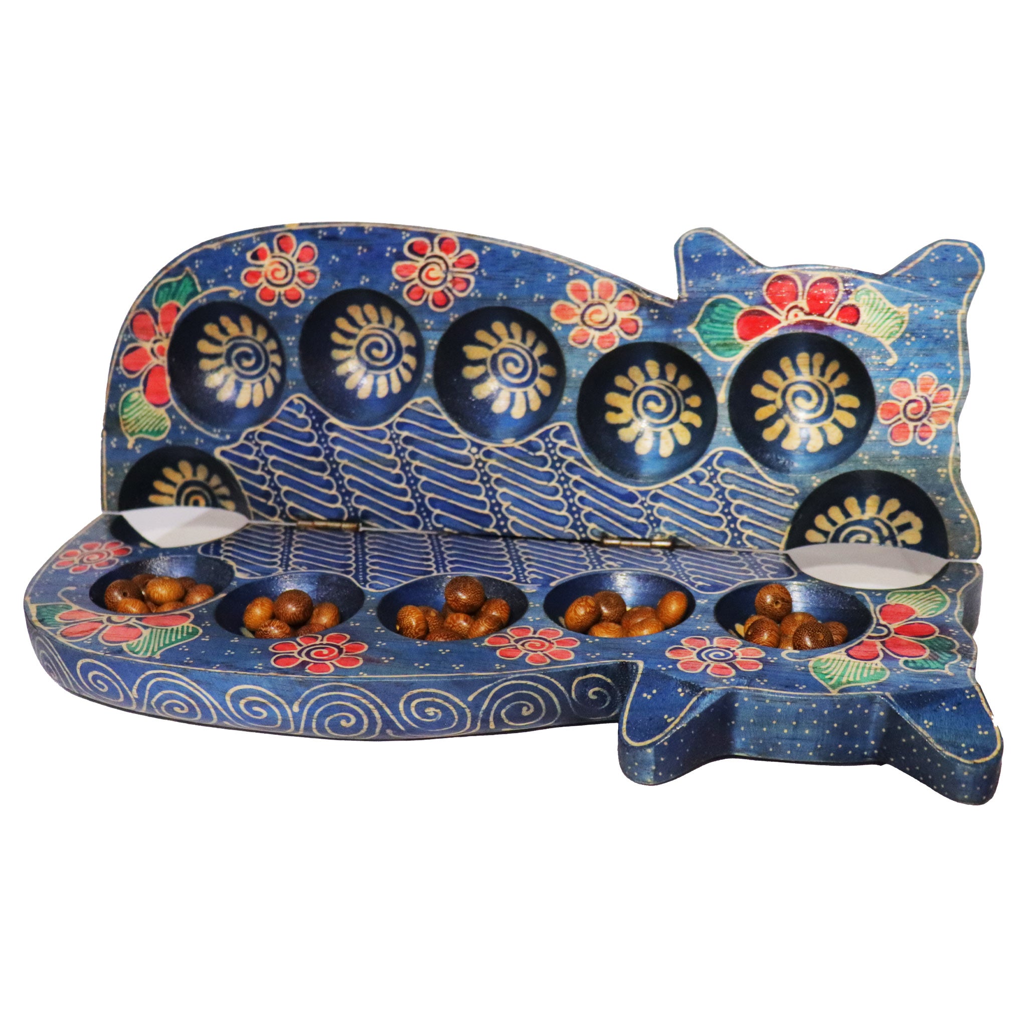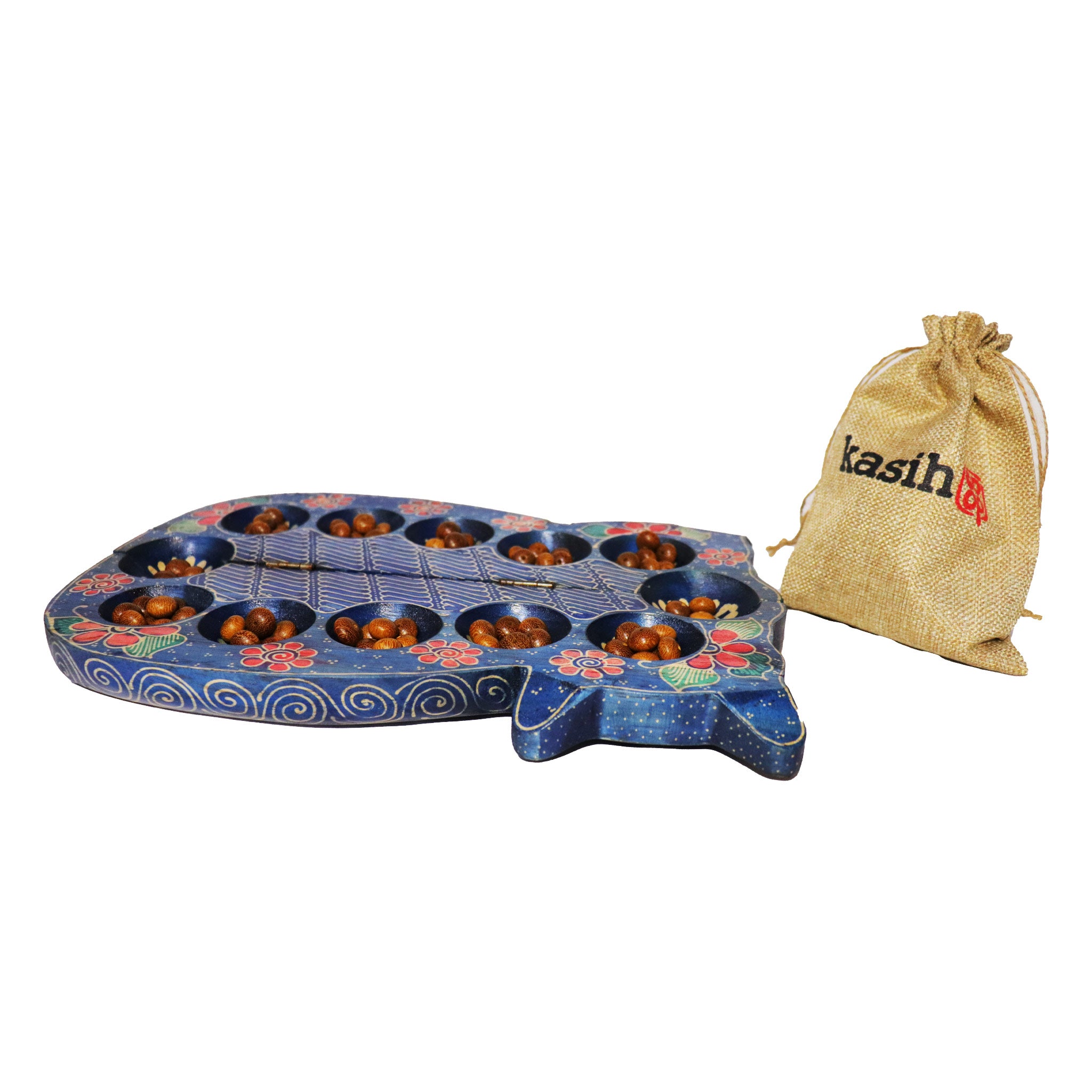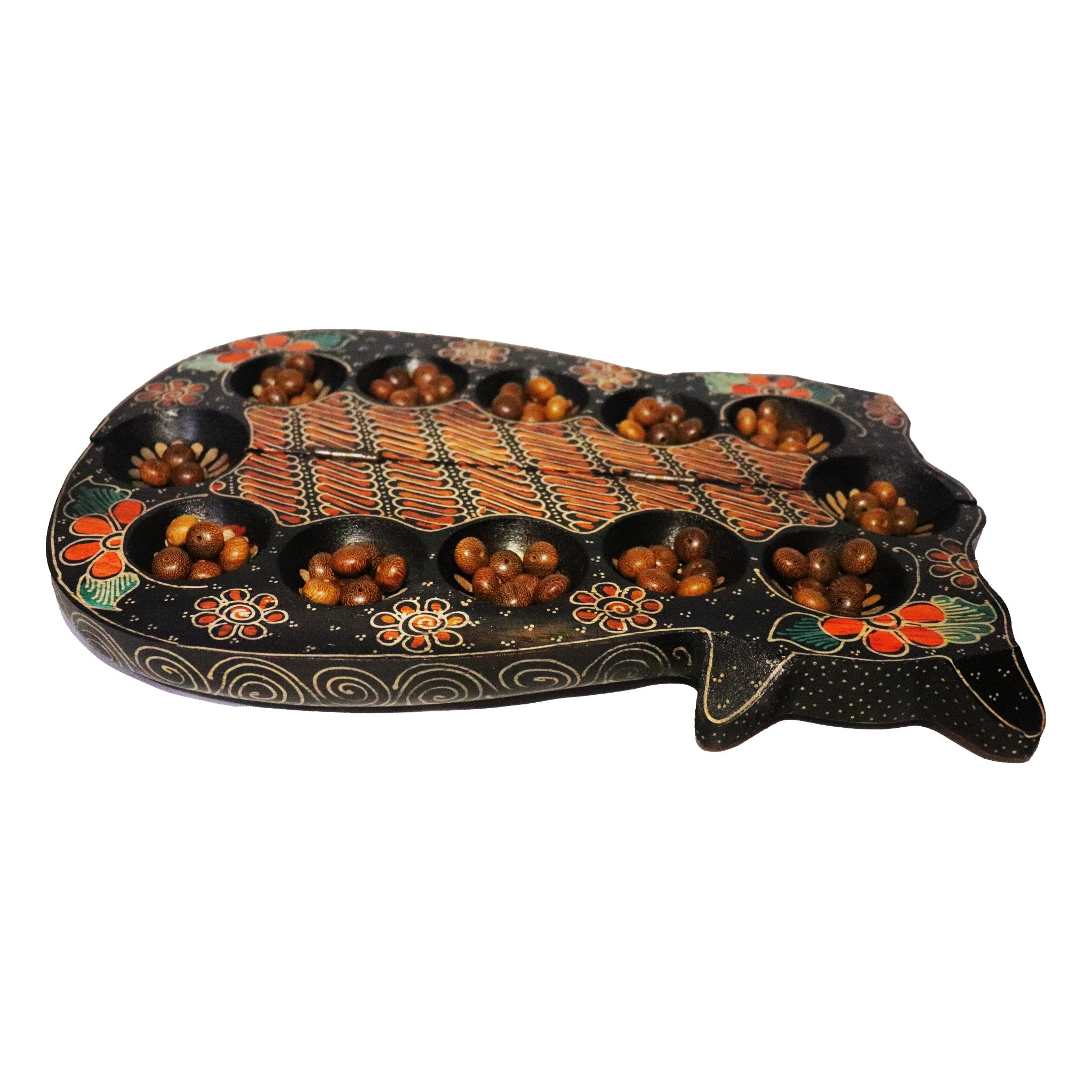 - Our mancala board is handcrafted from albacia wood; which our artisans then hand-drawn using canting tool with hot wax; before submerging the whole wood to dye and color the pattern.