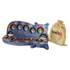 Handmade Albacia wood mancala, dakon, congklak made by our artisans in Indonesia. Sold with wooden beads in our branded Kasih Co-op pouch jute bag along with an instruction on how to play our mancala board game set.