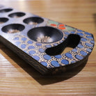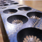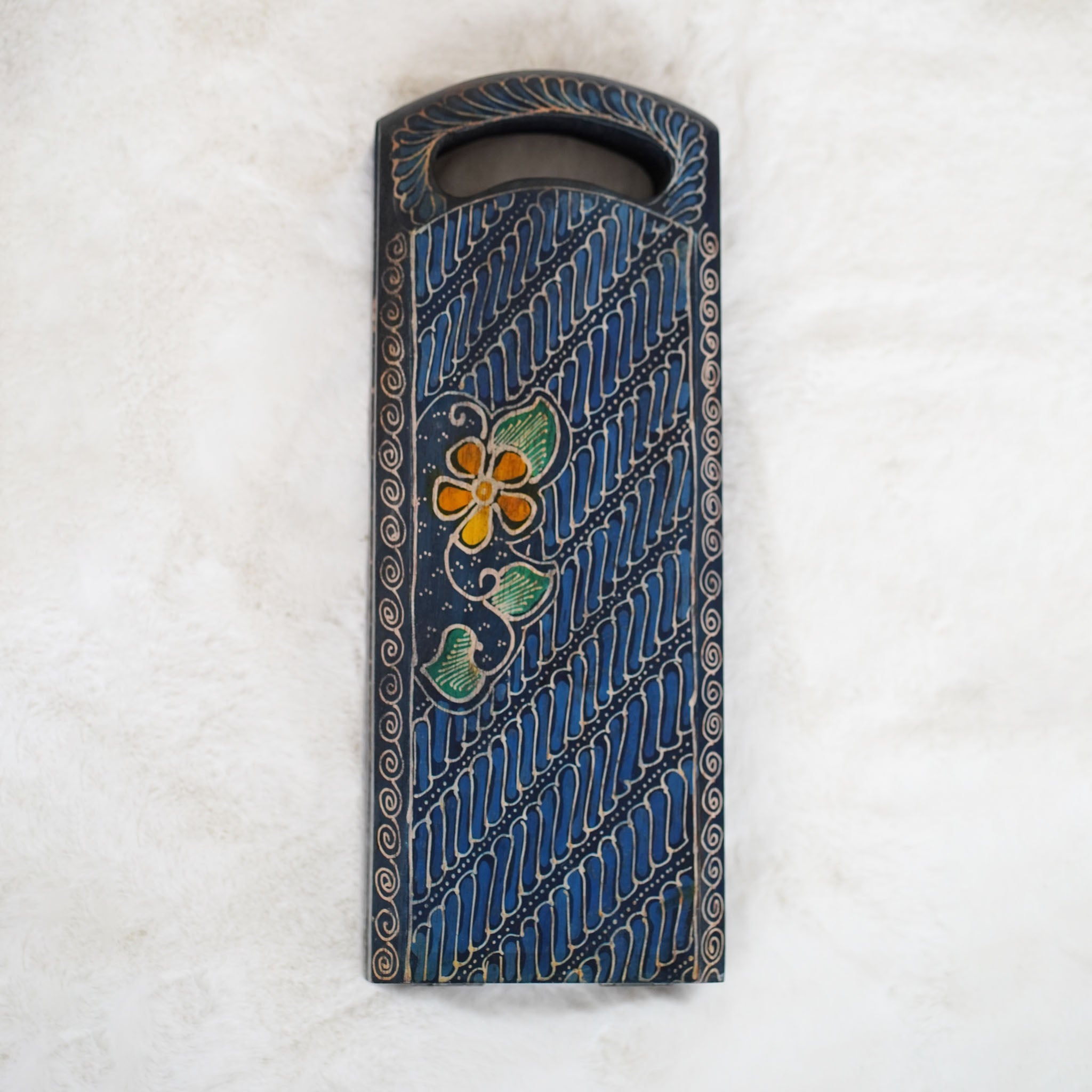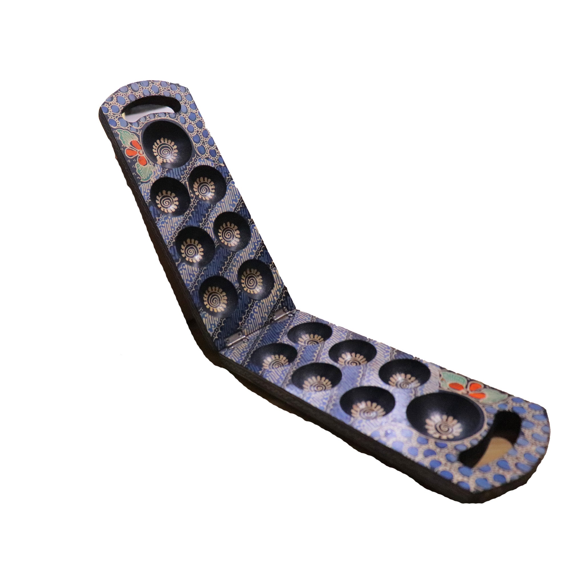 - Our mancala board is handcrafted from albacia wood; which our artisans then hand-drawn using canting tool with hot wax; before submerging the whole wood to dye and color the pattern.