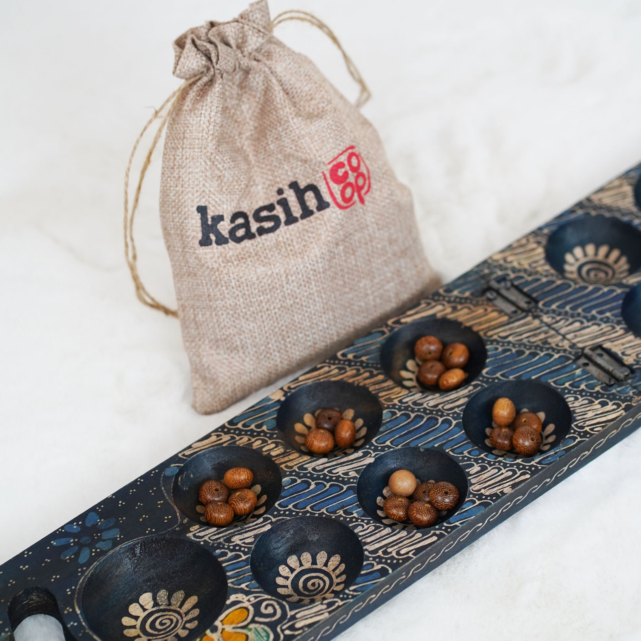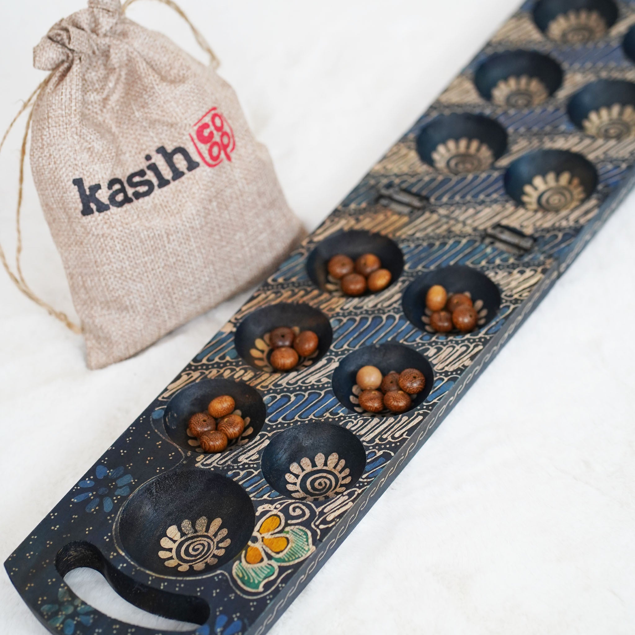 Handmade Albacia wood mancala, dakon, congklak made by our artisans in Indonesia. Sold with wooden beads in our branded Kasih Co-op pouch jute bag along with an instruction on how to play our mancala board game set.