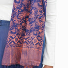 This is a hand-dyed and hand-stamped batik scarf, handmade by artisans.