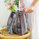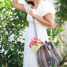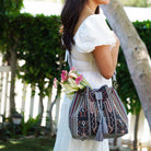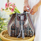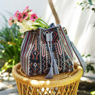 - Drawstring handbag with handwoven ikat fabric called Ayo Tupas made by Indonesian artisans from East Nusa Tenggara.