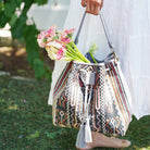 This is a handmade medium size bag, made of leather and natural dye handwoven ikat Ayo Tupas from East Nusa Tenggara, Indonesia. This medium-sized bag, meticulously handmade by Indonesian artisans, harmoniously combines gray leather and handwoven ikat Ayo Tupas fabric from East Nusa Tenggara.