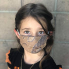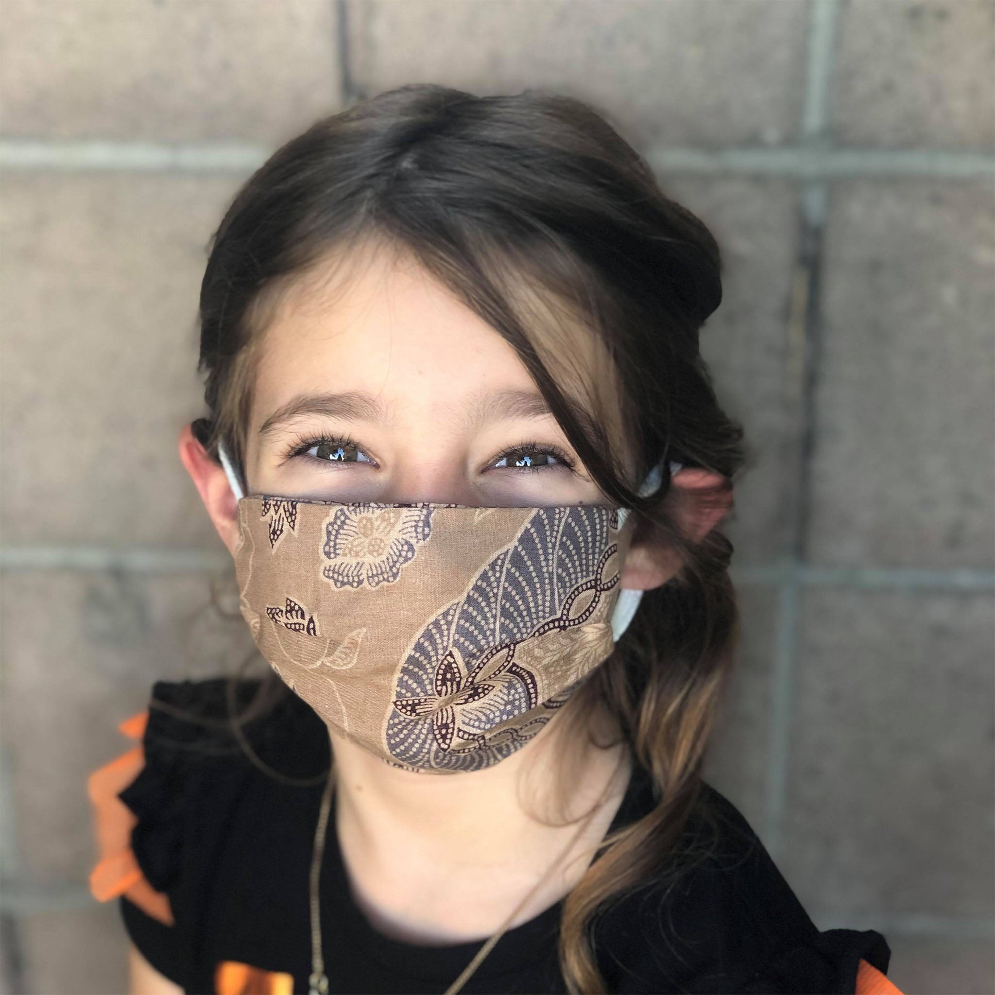 This is a kids size washable rectangle batik face mask with pocket insert and elastic strap around the ears.