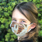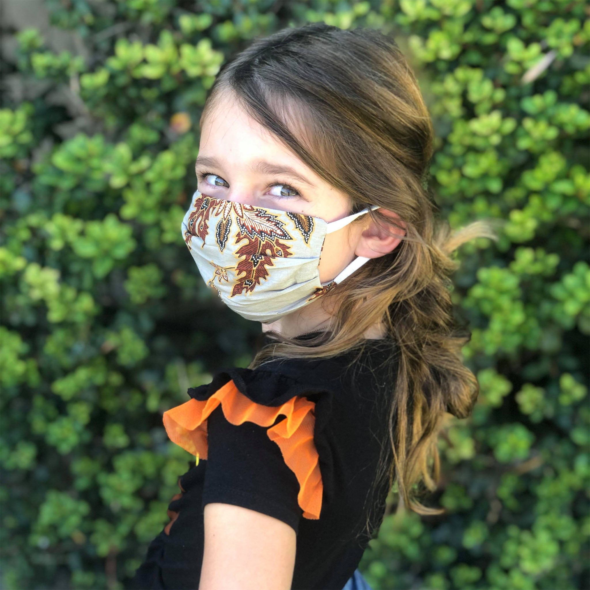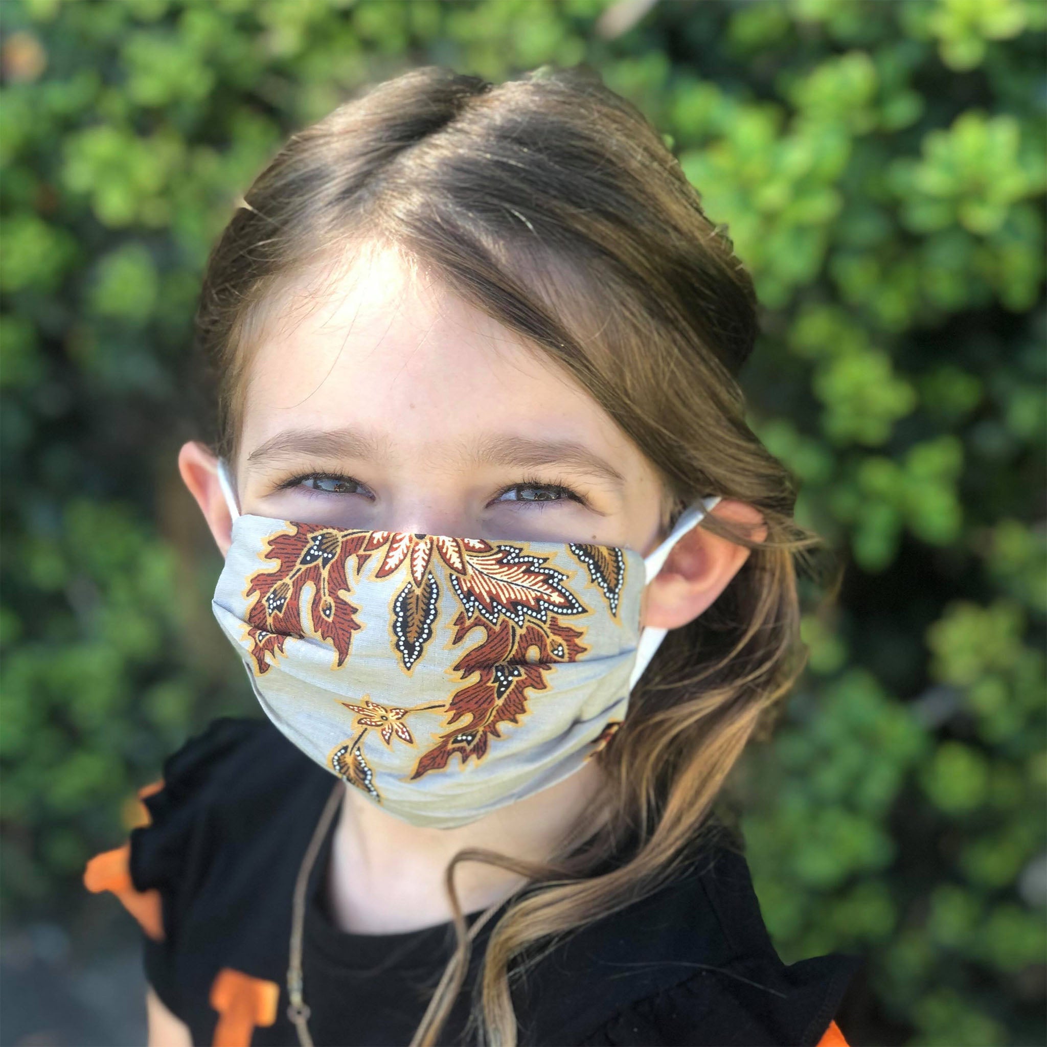 This is a kids size washable rectangle batik face mask with pocket insert and elastic strap around the ears.