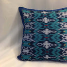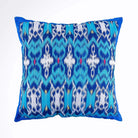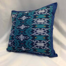 Handmade ONE ikat pillow cover with blue pattern.