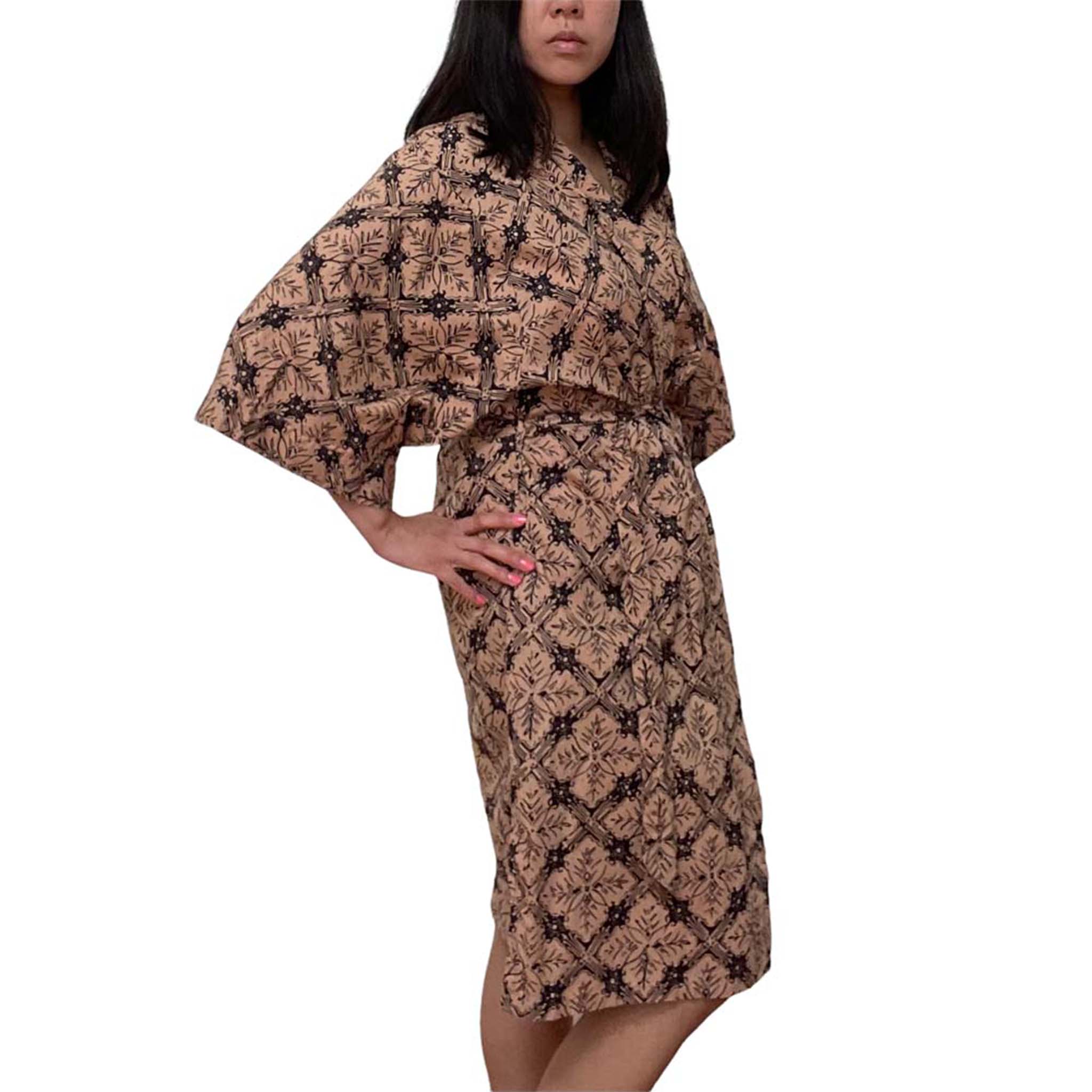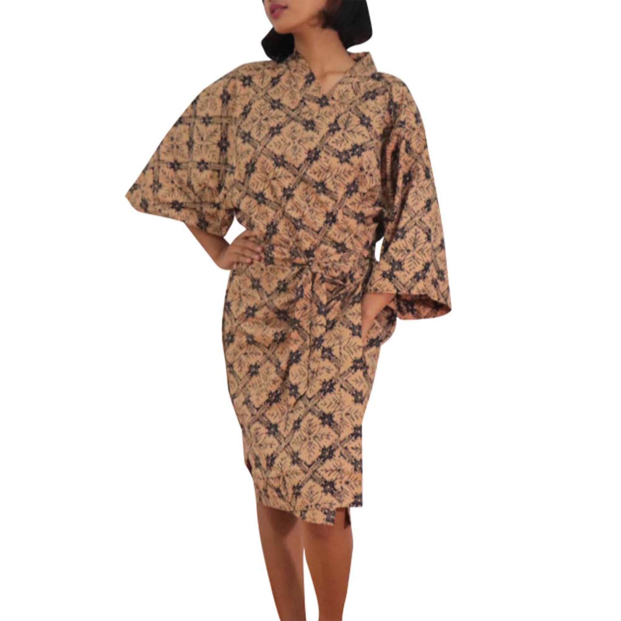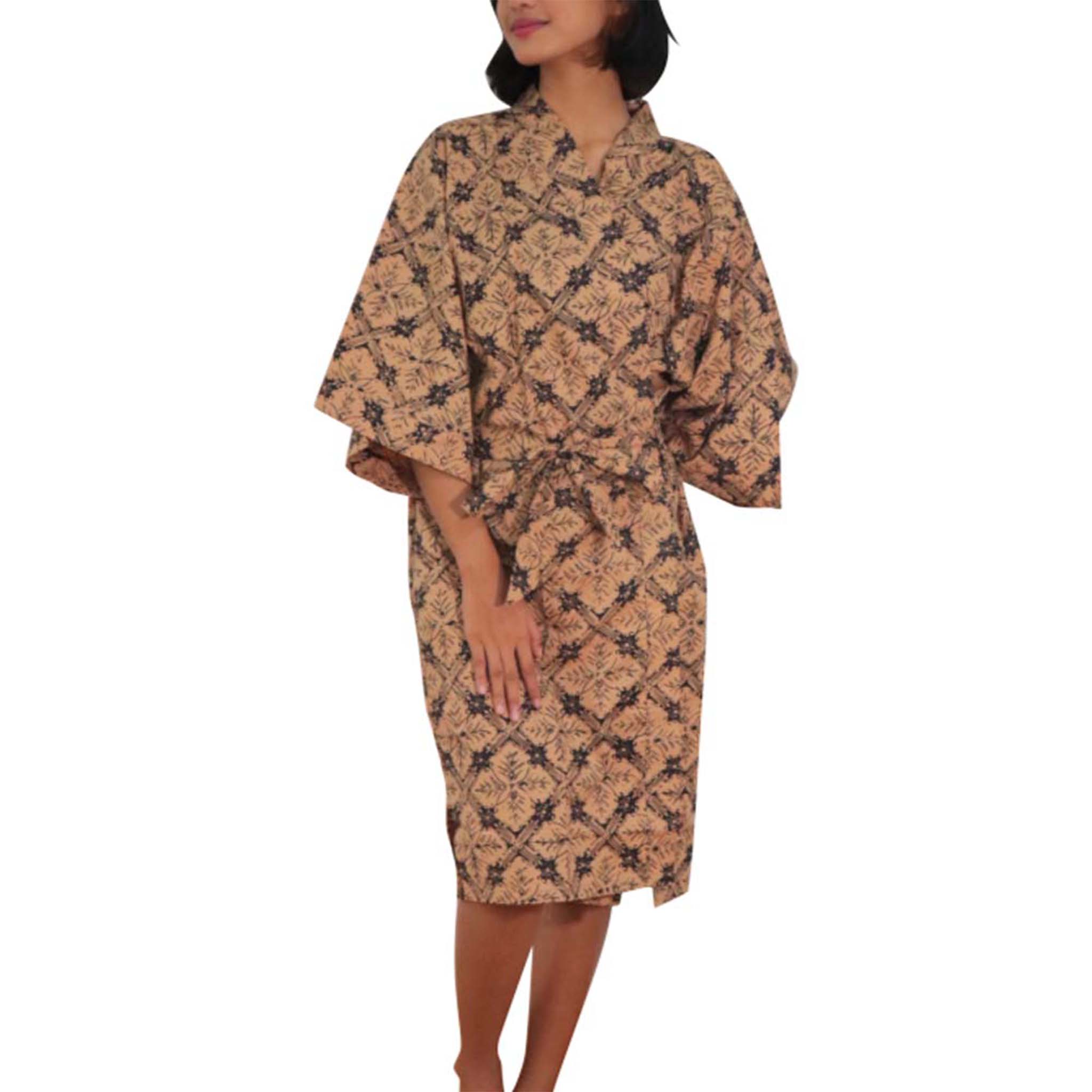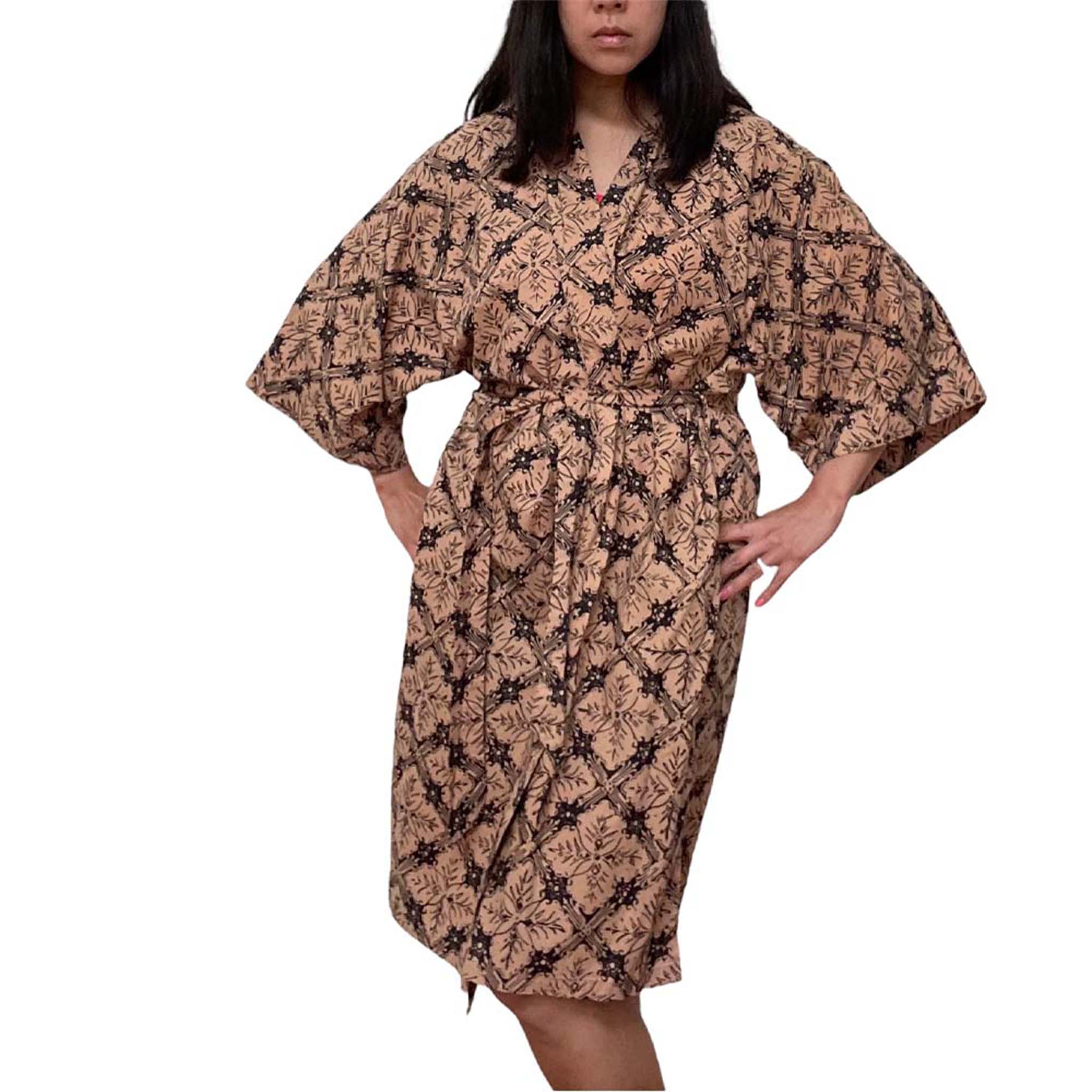 This batik kimono robe is made from white cotton fabric that is then hand-stamped and hand-dyed using 700 years old batik wax and dye technique. The batik fabric is also then sun baked.