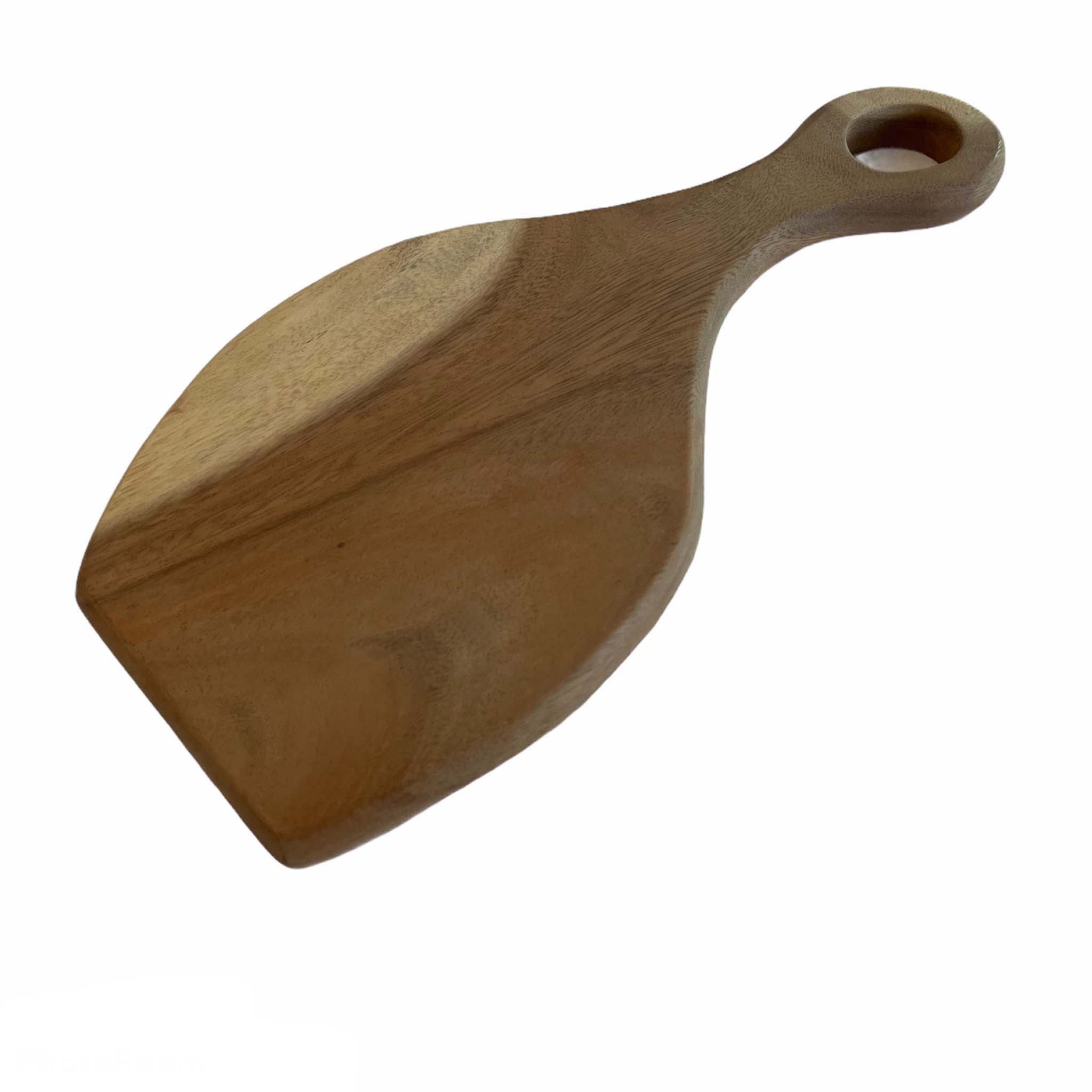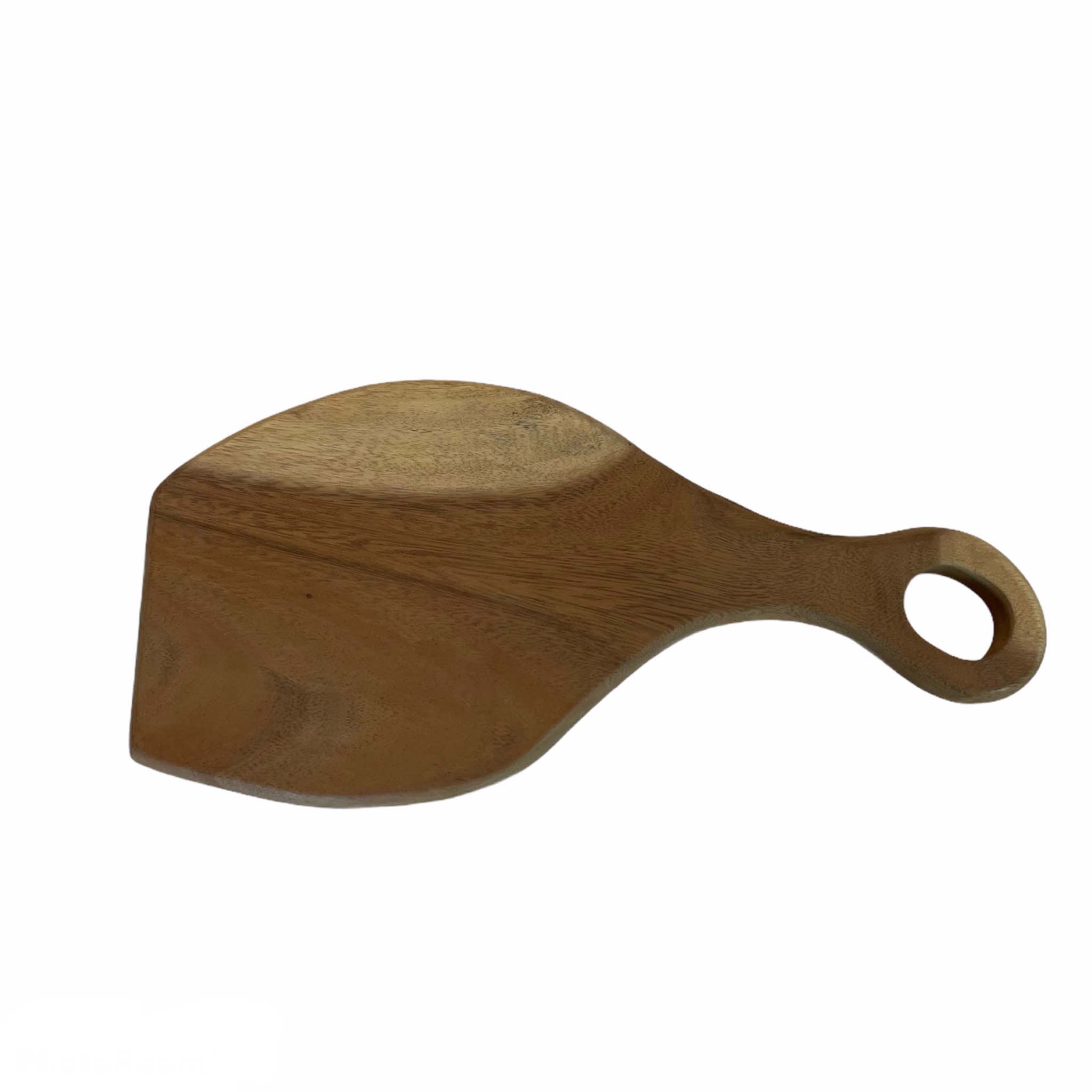 This is an acacia wood serving board or cheese platter that is handmade by artisans in Jepara, Java, Indonesia. The board is first kiln dried and the artisans then handmade the wood to end products by cutting the woods to make the tray. The board is then finished and polished with beeswax to protect the woods. This treatment is food safe.