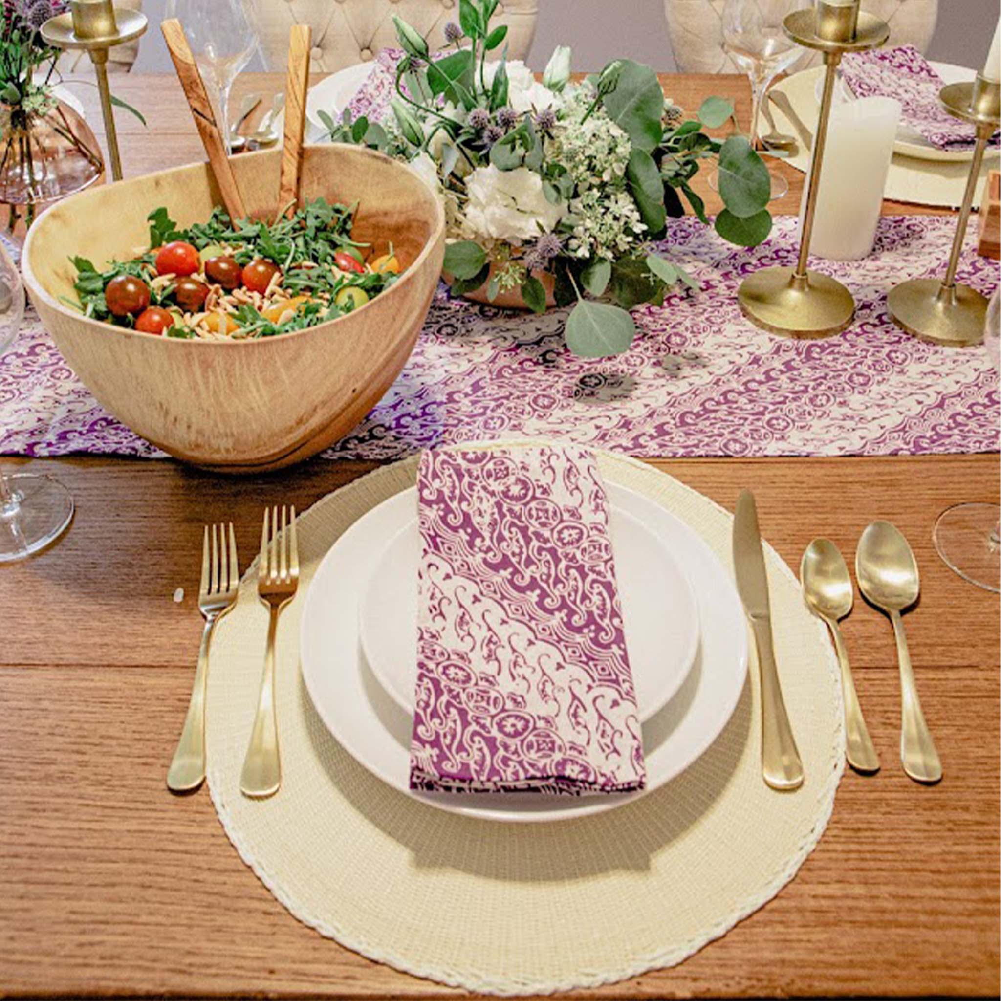 batik table linen, batik table cloth, batik tablescape, modern batik, handmade batik linen, handpainted batik fabric, washable, reusable batik napkin, boho tablescape, bohemian tablesetting, purple cotton batik fabric, handblock print, hand block print, handstamped batik, batik cap, copper block batik print, ecofriendly gift, ecofriendly napkin, sustainable gift, fair trade gift, artisan made, hostess gift, hostess with the mosess gift idea, house warming gift, welcome gifts