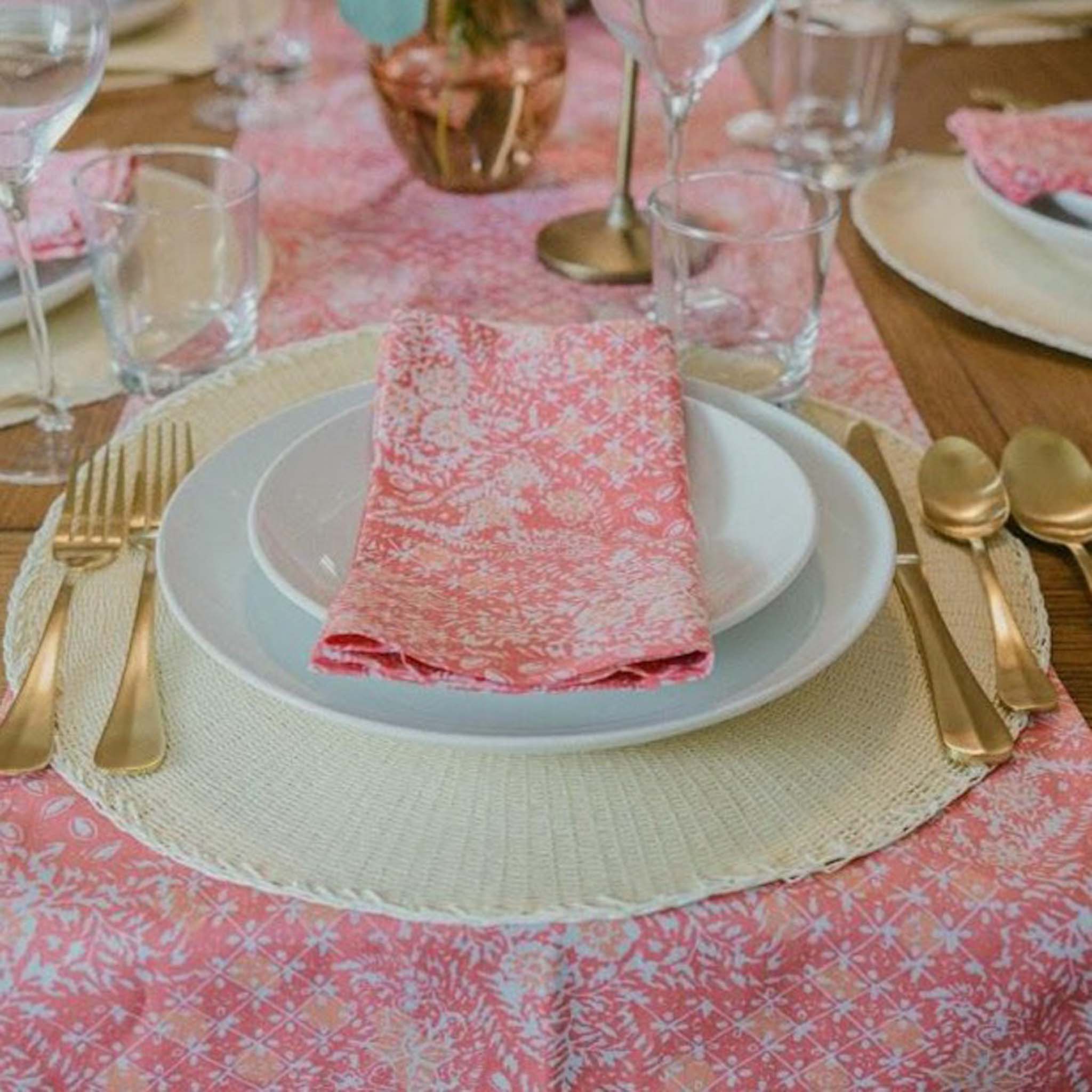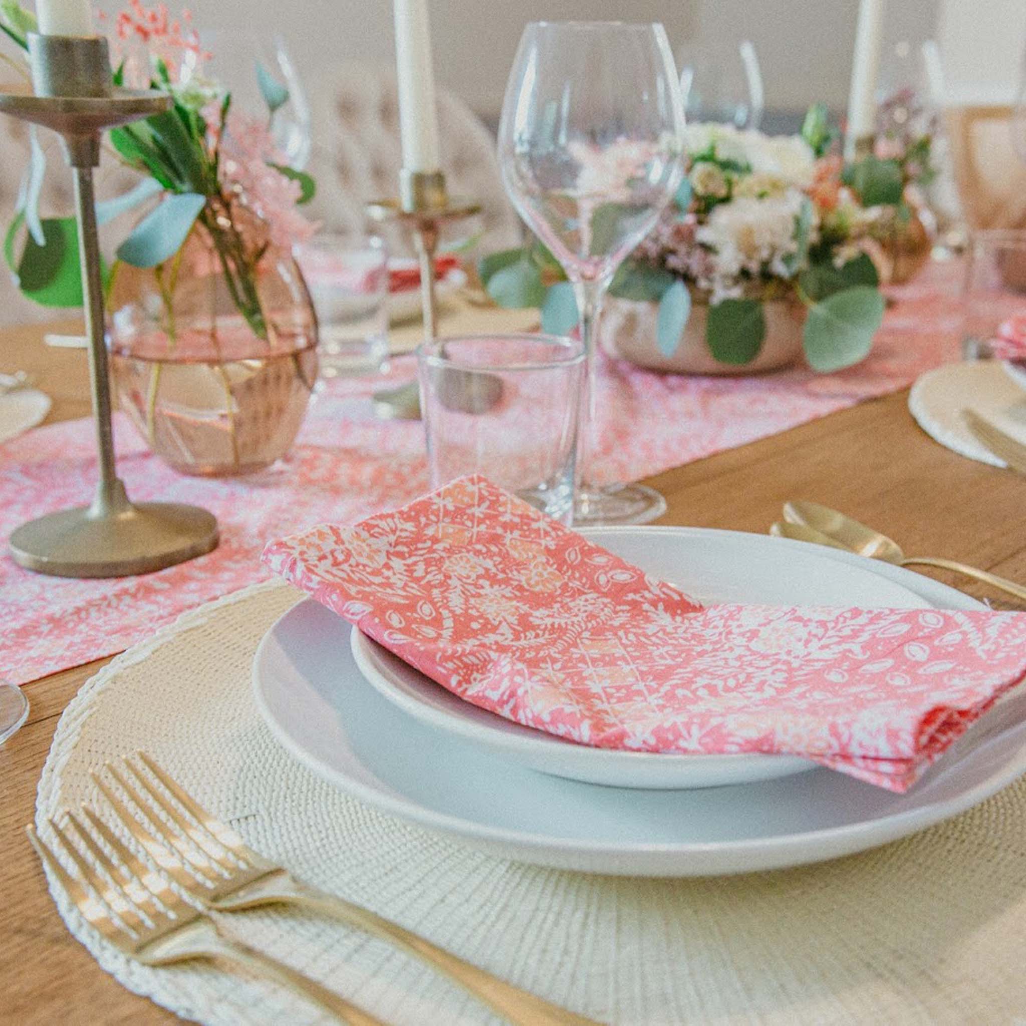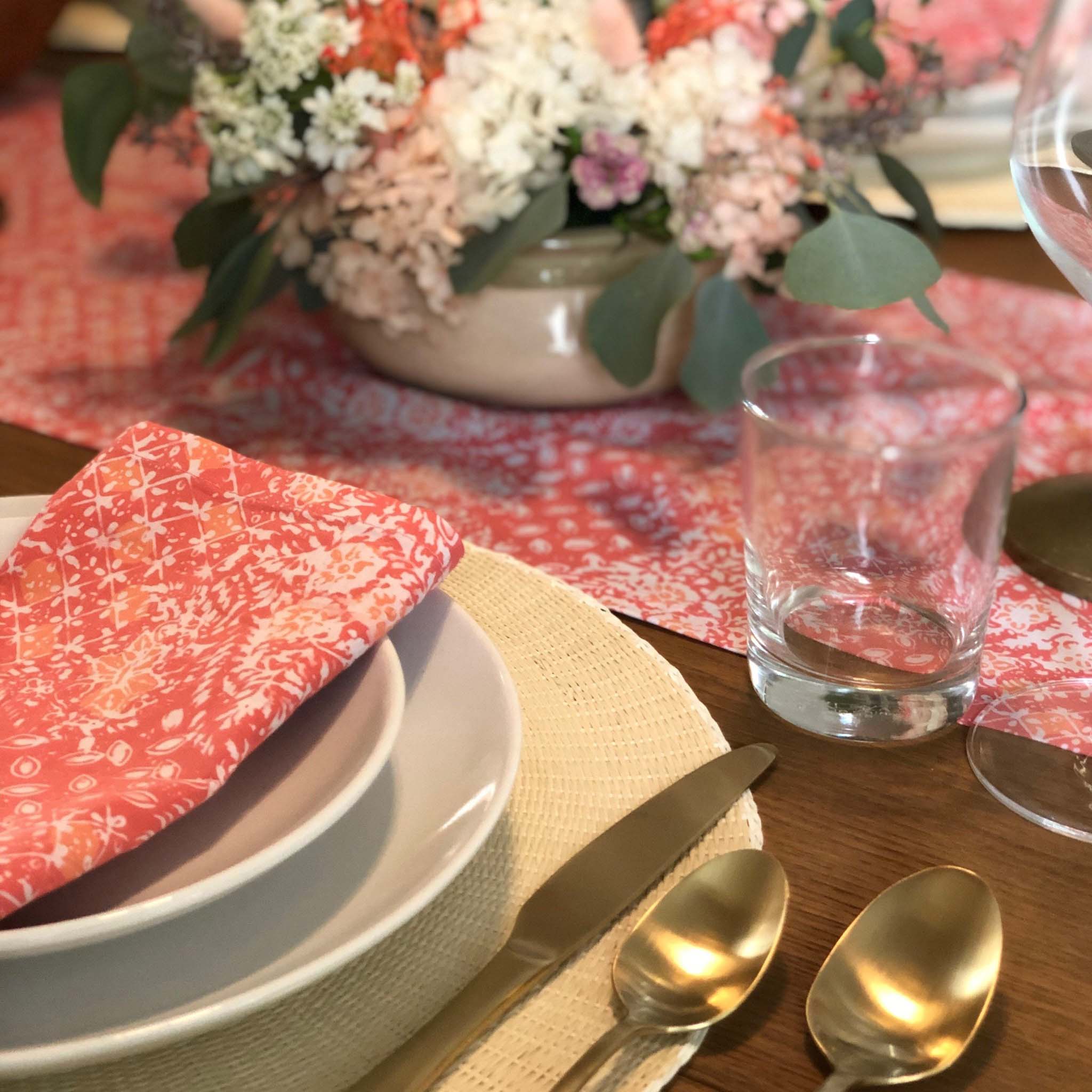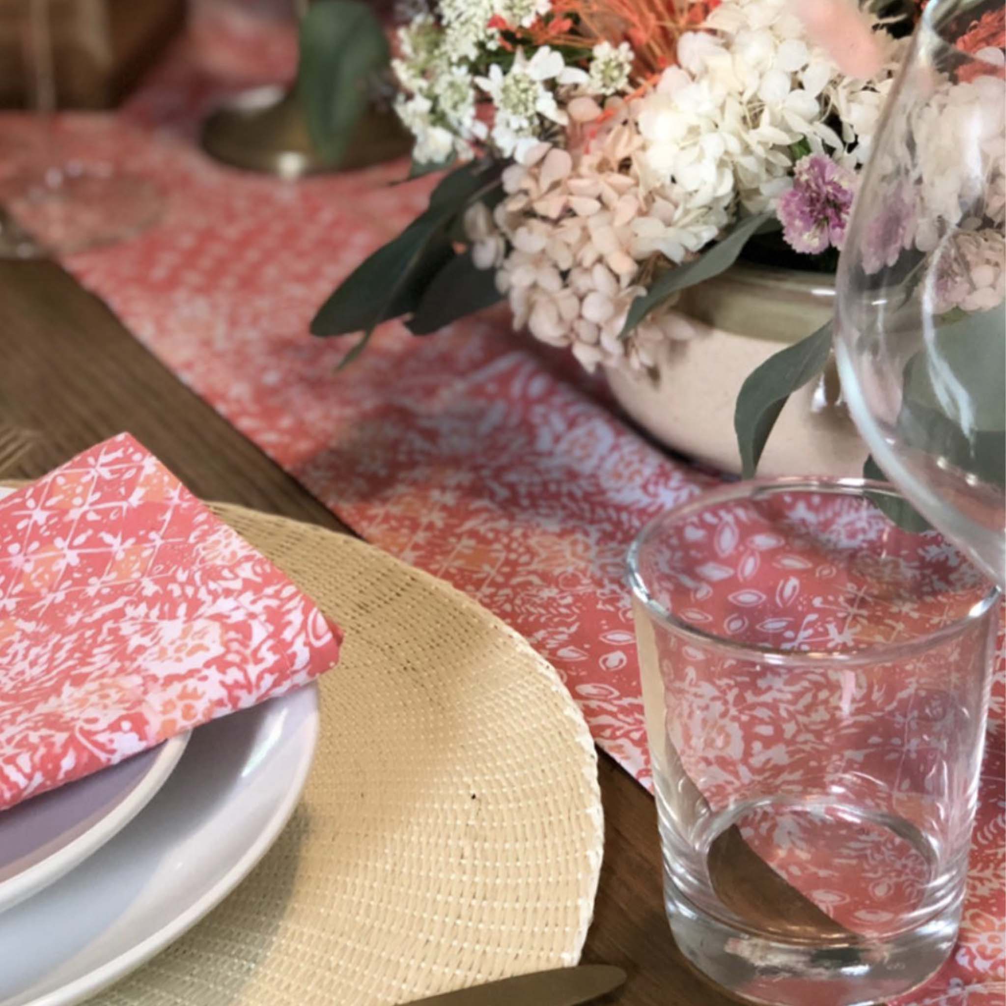 batik table linen, batik table cloth, batik tablescape, modern batik, handmade batik linen, handpainted batik fabric, washable, reusable batik napkin, boho tablescape, bohemian tablesetting, pink cotton batik fabric, handblock print, hand block print, handstamped batik, batik cap, copper block batik print, ecofriendly gift, ecofriendly napkin, sustainable gift, fair trade gift, artisan made, hostess gift, hostess with the mosess gift idea, house warming gift, welcome gifts