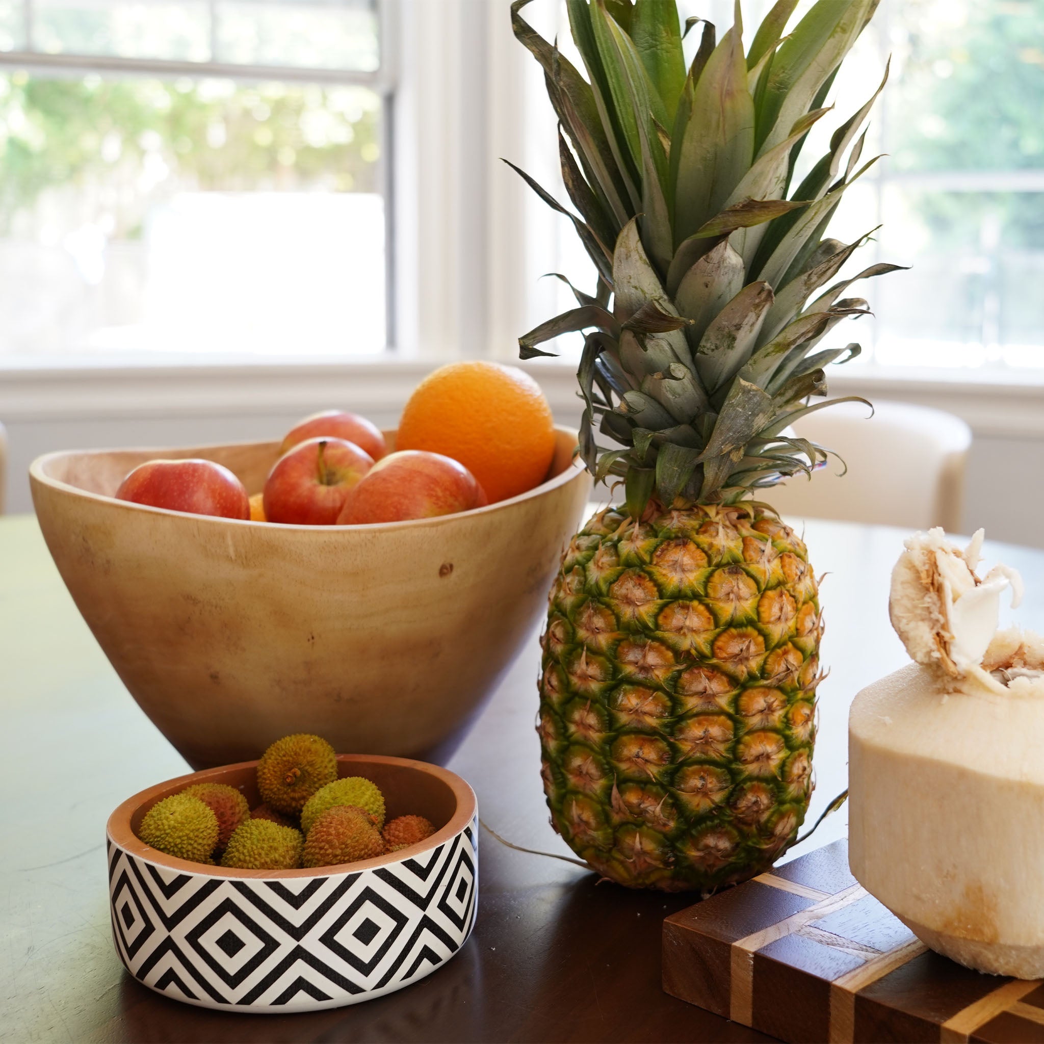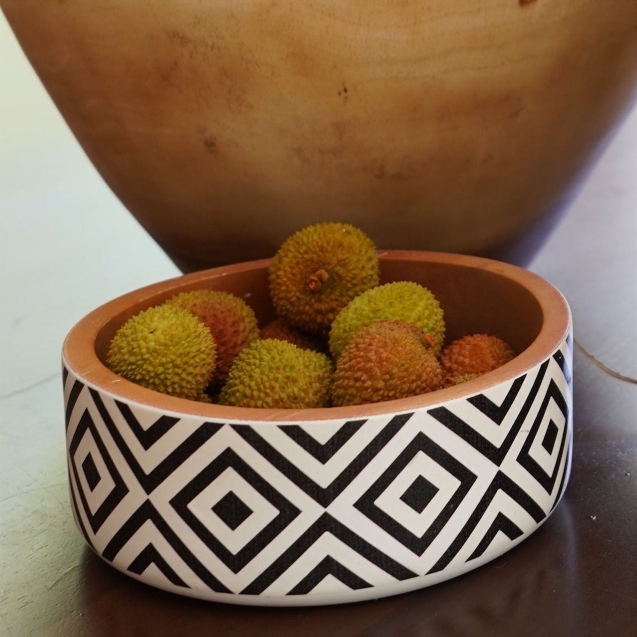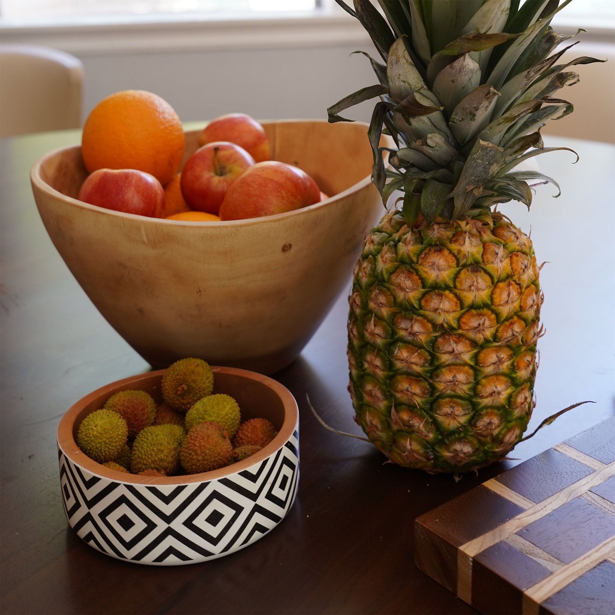 Handmade mahogany wood medium bowl mixed with printed retro black and white decorations, made by artisans in Indonesia. This bowl would be perfect for a single serve salad bowl, fruit bowl, or bohemian decorations.