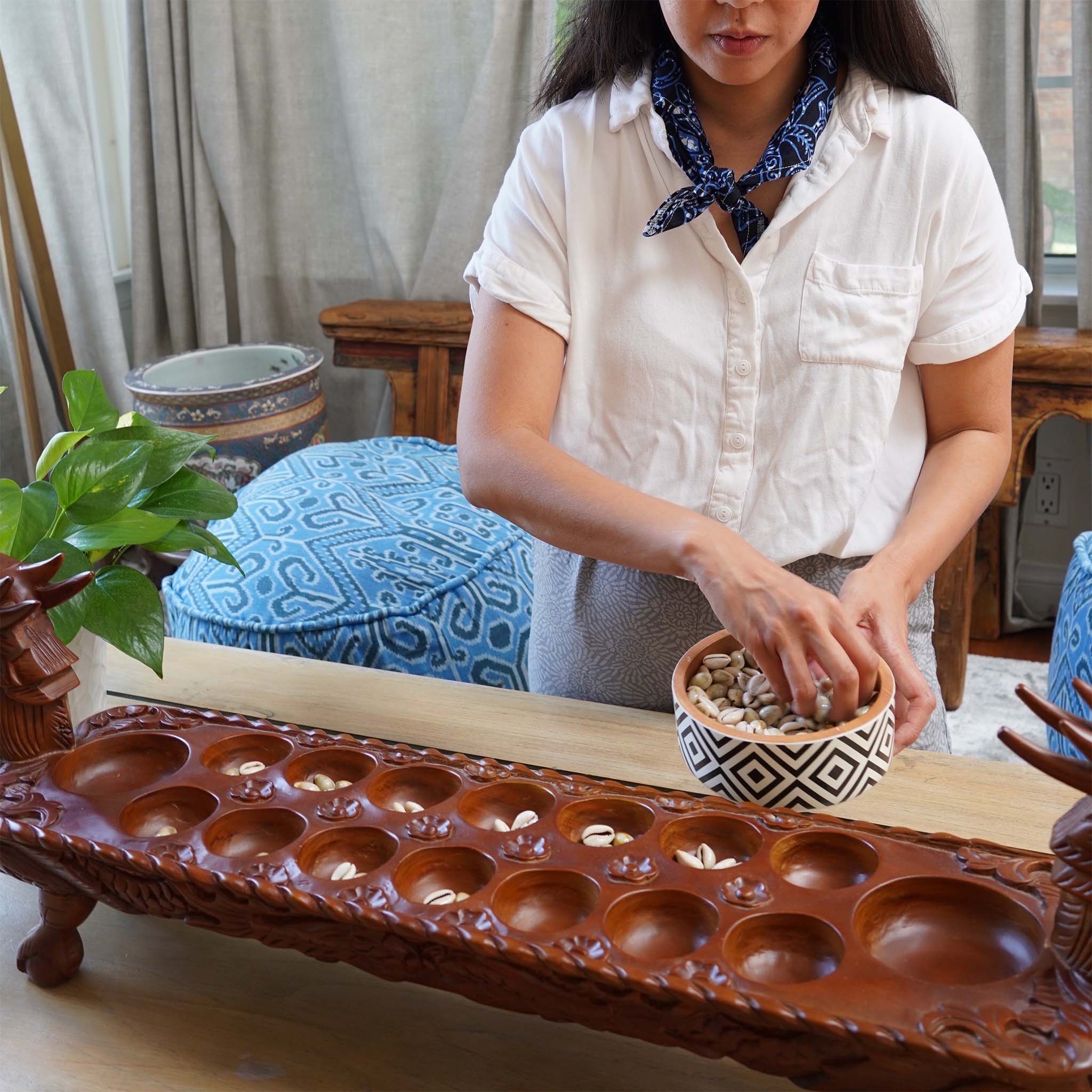 Mahogany wood bowl with black and white prints handmade in Indonesia small size