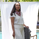 This is a hand-dyed and hand-stamped batik bandana, handmade by artisans. This fabric is handmade by artisans in Java using centuries old wax & dye batik technique.