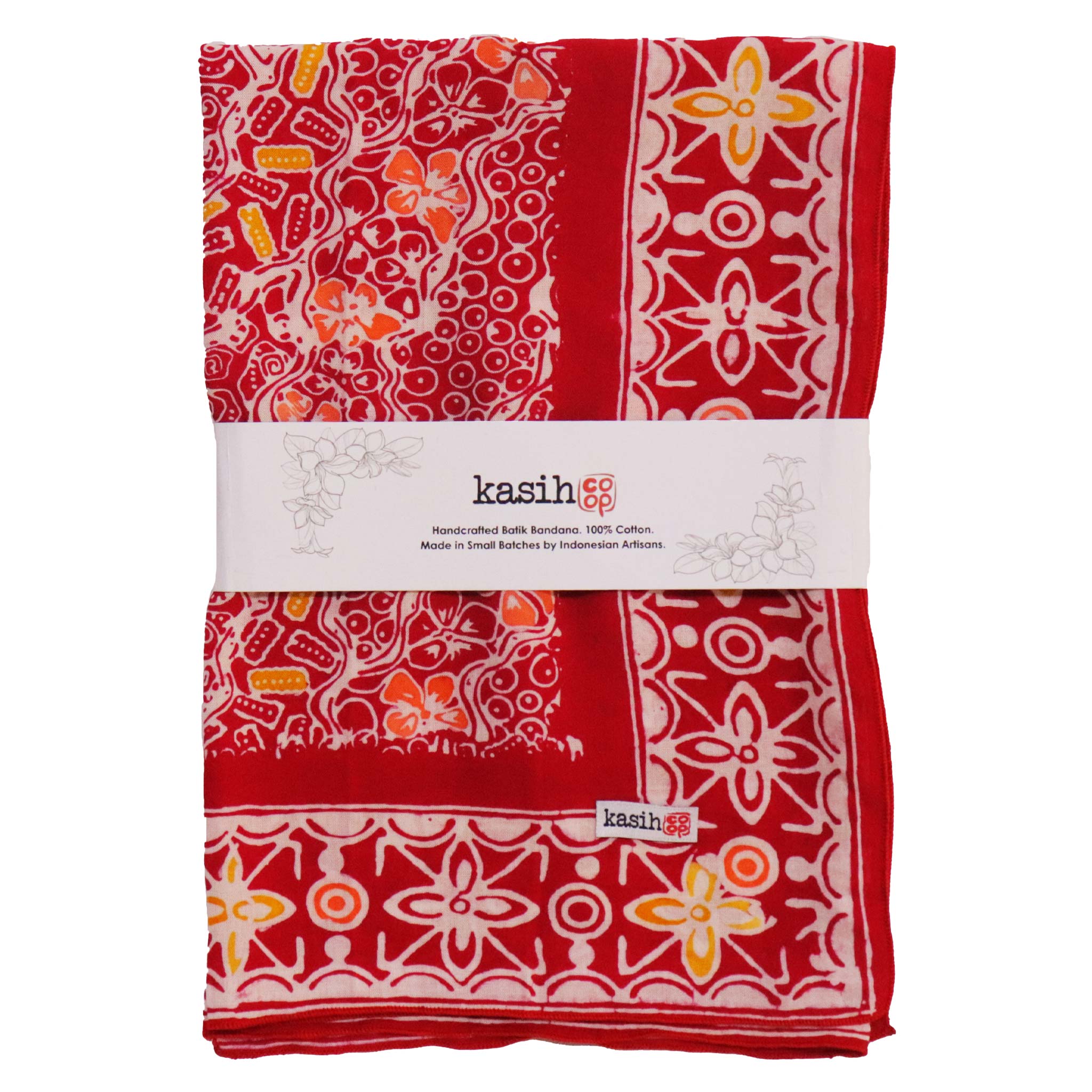 This is a hand-dyed and hand-stamped batik bandana, handmade by artisans. This fabric is handmade by artisans in Java using centuries old wax & dye batik technique.