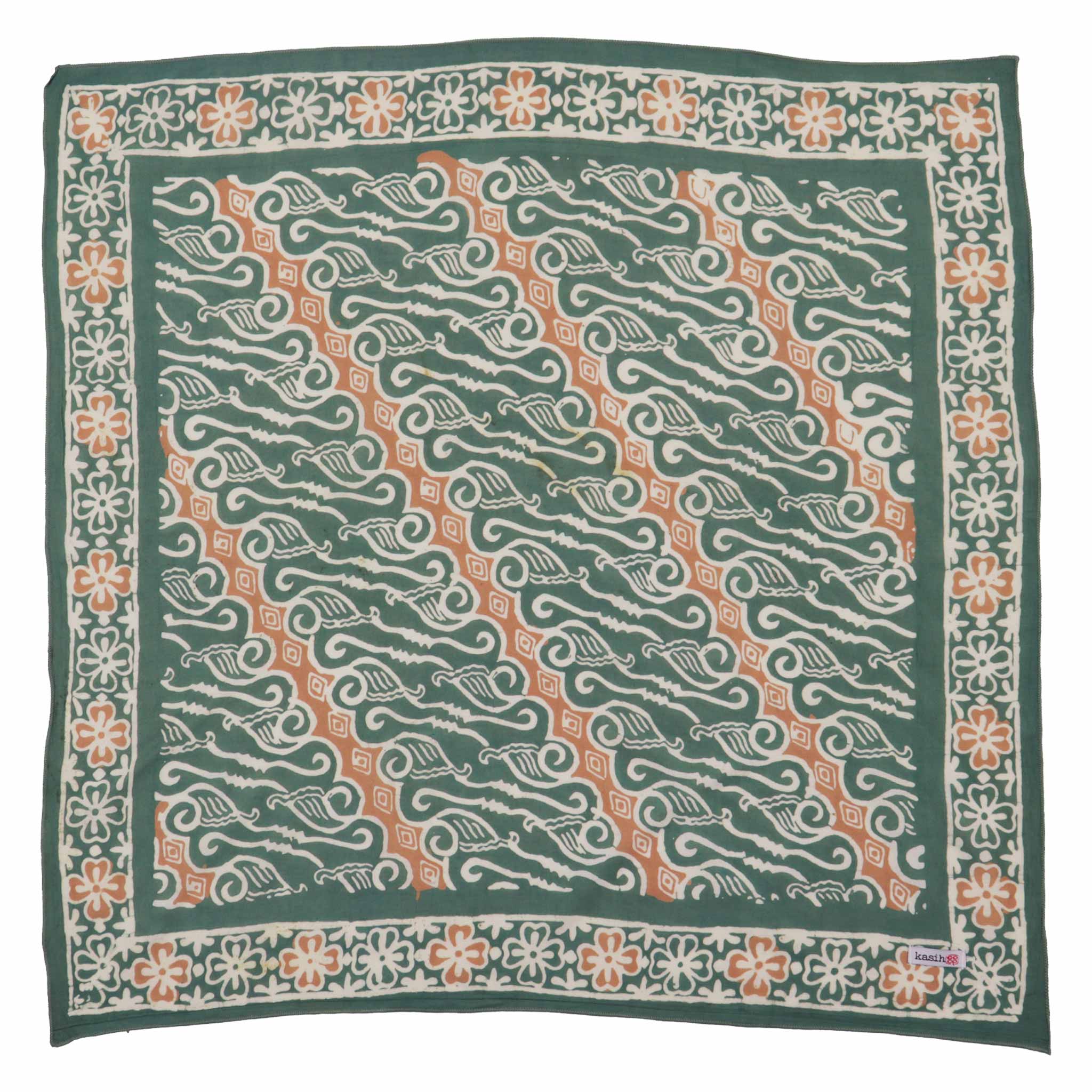 Ce bandana est fabriqué à partir de tissu de coton blanc qui est ensuite estampé et teint à la main selon une technique de cire et de teinture batik vieille de 700 ans. Le tissu batik est également ensuite cuit au soleil. Vous devez vous attendre à une certaine variation de couleur.