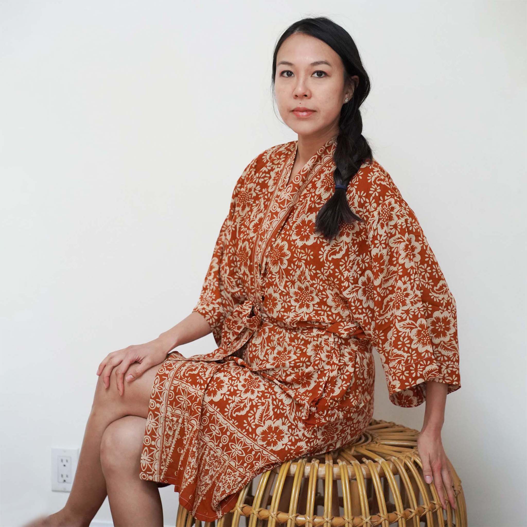 - Cette robe kimono en batik est conçue à Manhattan Beach, en Californie et fabriquée à la main par des artisans de Java, en Indonésie.