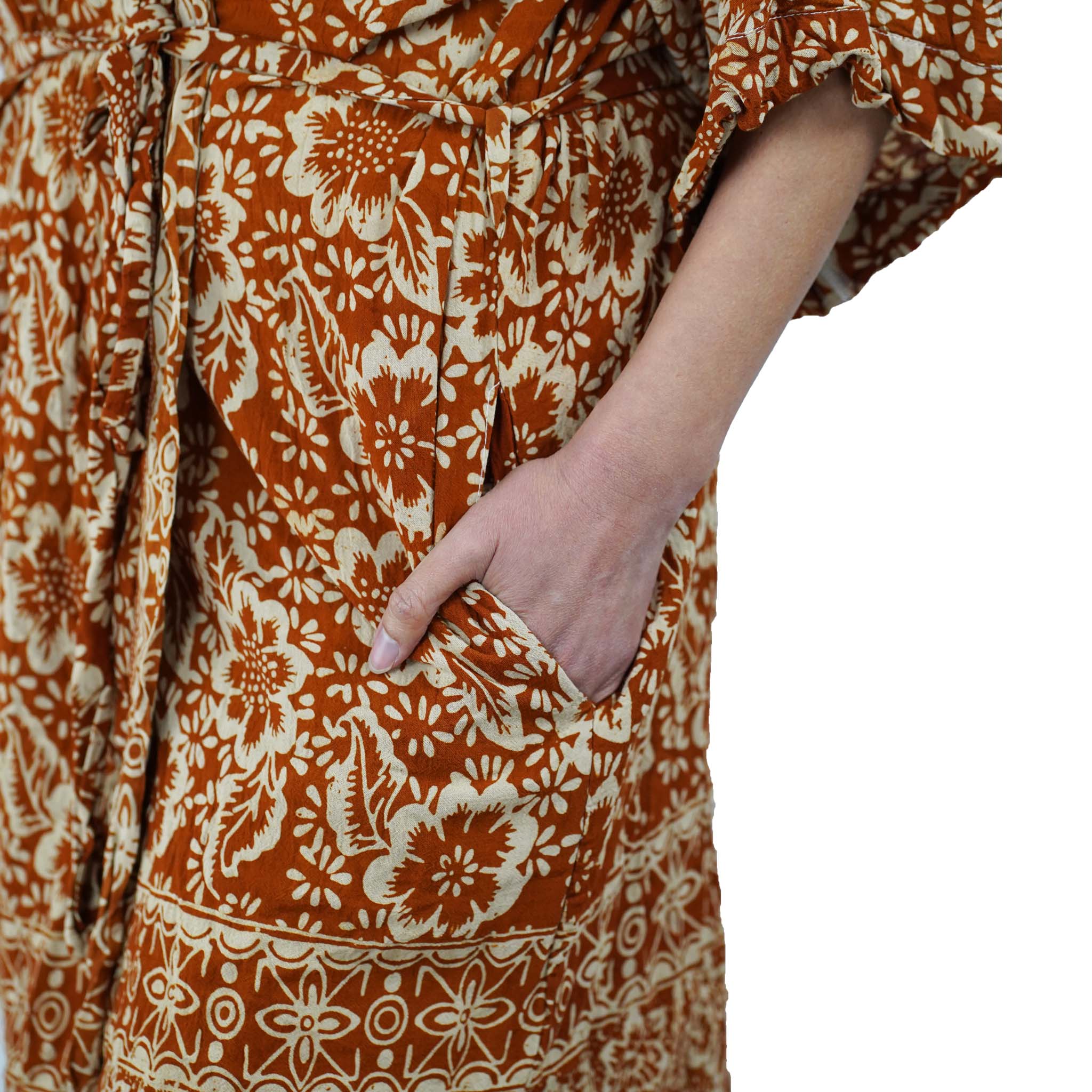 Cette robe kimono en batik est fabriqué à partir de tissu de coton blanc qui est ensuite estampé et teint à la main en utilisant une technique de cire et de teinture batik vieille de 700 ans. Le tissu batik est également ensuite cuit au soleil.