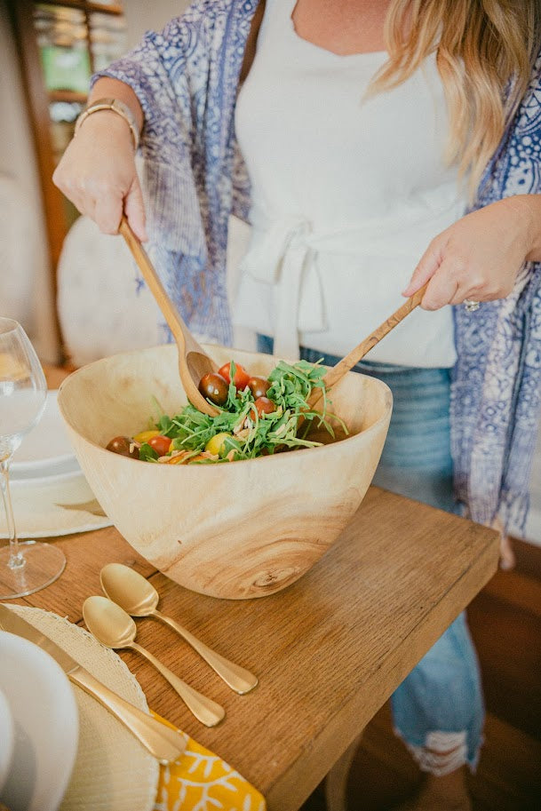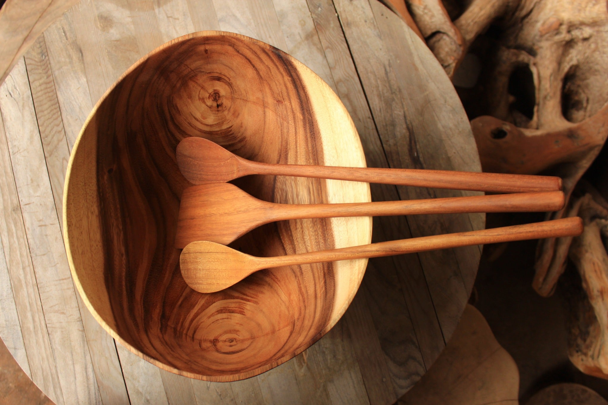 Sourced using legal wood to prevent illegal logging from Indonesia. Kasih Co-op offers hand-turned teak wood bowls and handmade tabletops.