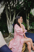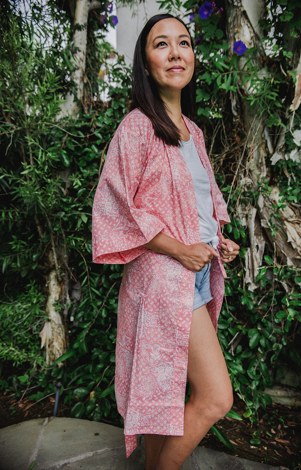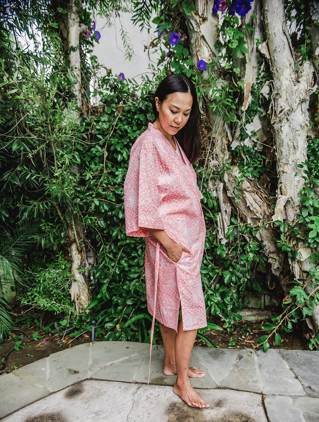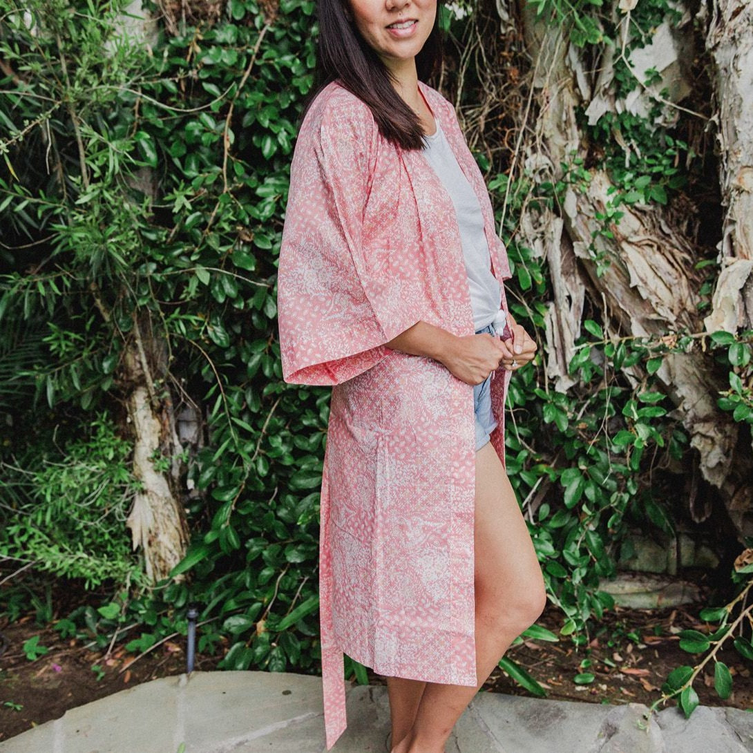 - Cette robe kimono en batik est conçue à Manhattan Beach, en Californie et fabriquée à la main par des artisans de Java, en Indonésie.