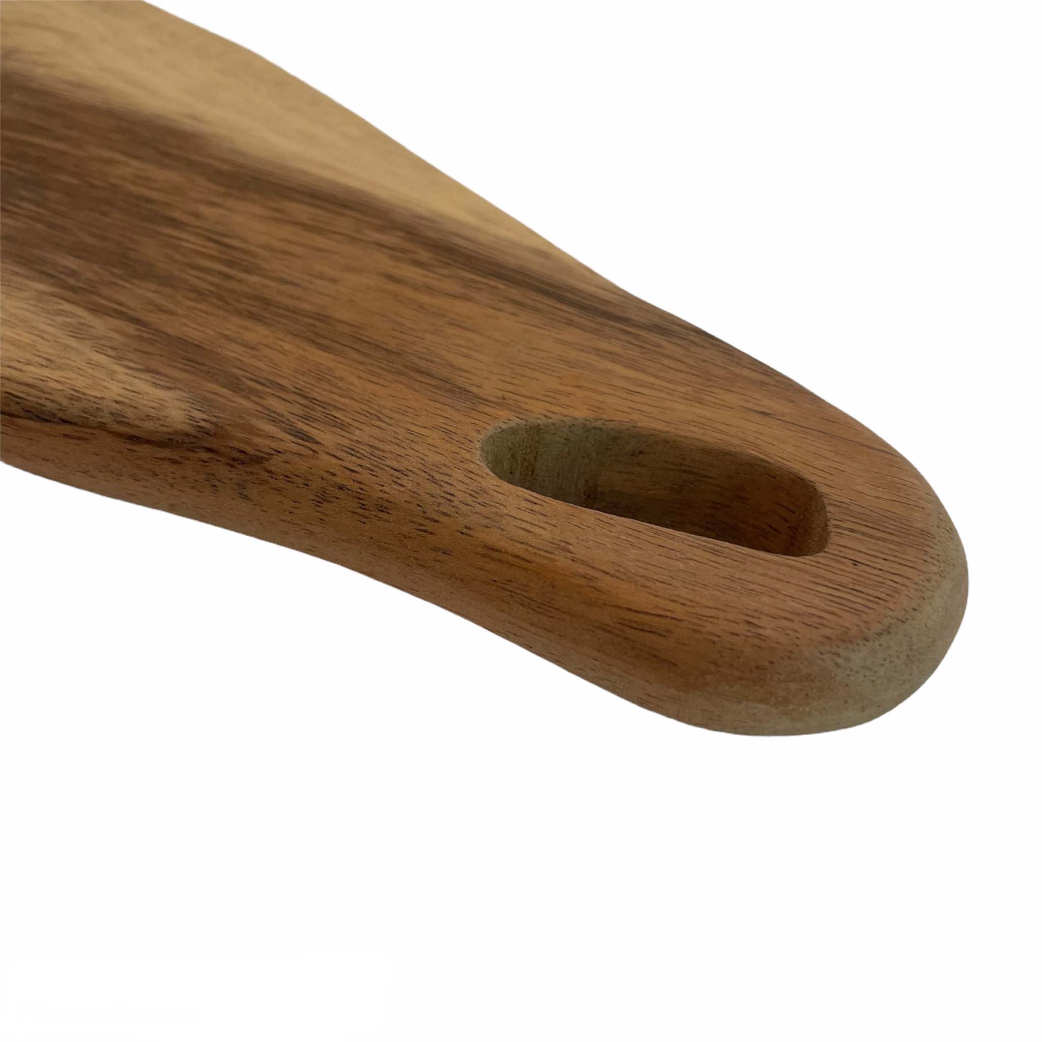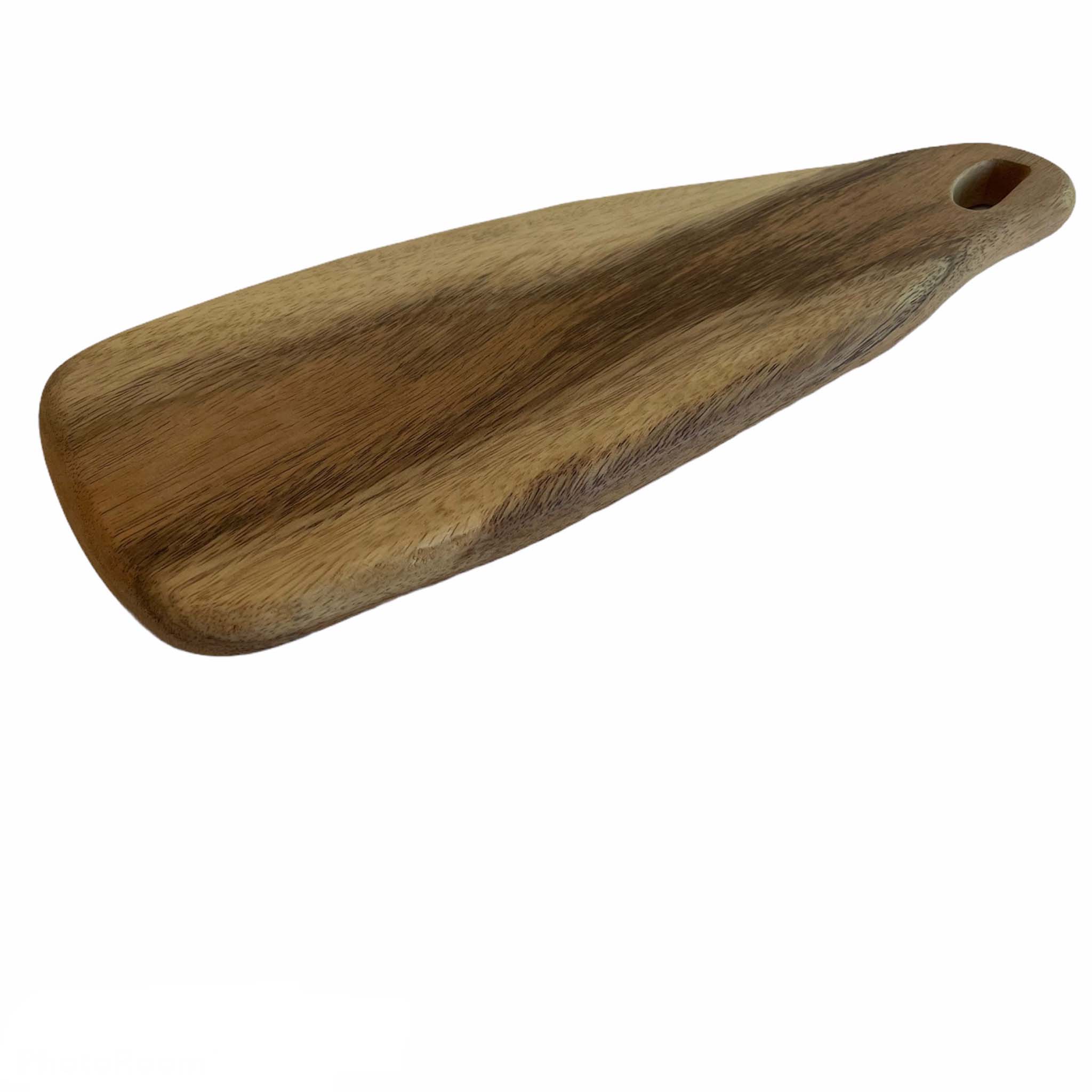 This is an acacia wood serving board or cheese platter that is handmade by artisans in Jepara, Java, Indonesia. The board is first kiln dried and the artisans then handmade the wood to end products by cutting the woods to make the tray. The board is then finished and polished with beeswax to protect the woods. This treatment is food safe.