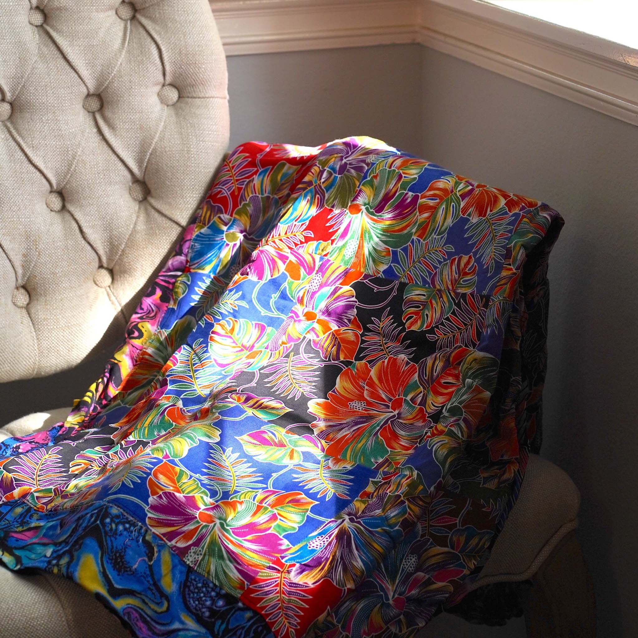 - Lightweight blanket with batik print quilt on both sides. Both sides are made of reversible patchworks batik prints.