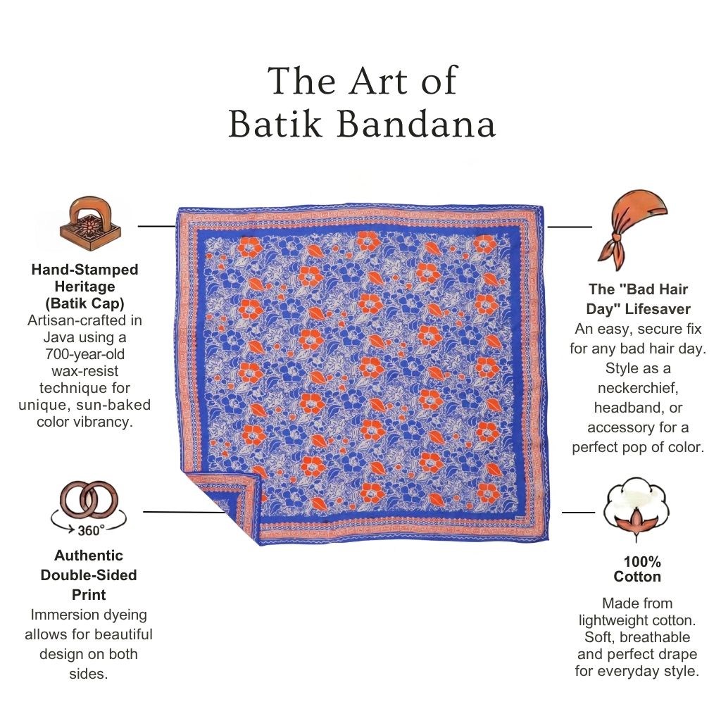Wearable art rooted in Indonesian heritage — crafted using a centuries-old batik wax-and-dye technique. An oversized 100% ultra-soft cotton bandana with endless ways to wear it.
